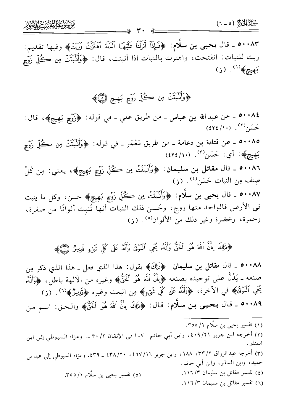 ٥٠٠٨٥ - عن قتادة بن دعامة -من طريق مَعْمَر- في قوله: {وأنبتت من كل زوج بهيج}: أي: حَسَن (¬٣). (١٠/ ٤٢٤)