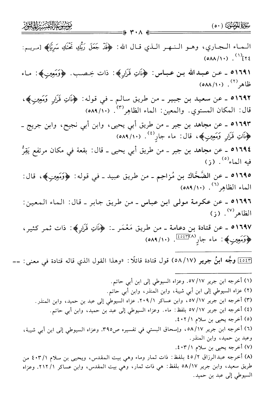 ٥١٦٩٣ - عن مجاهد بن جبر -من طريق أبي يحيى، وابن أبي نجيح، وابن جريج- {ذات قرار معين}، قال: ماء جارٍ (¬٤). (١٠/ ٥٨٩)