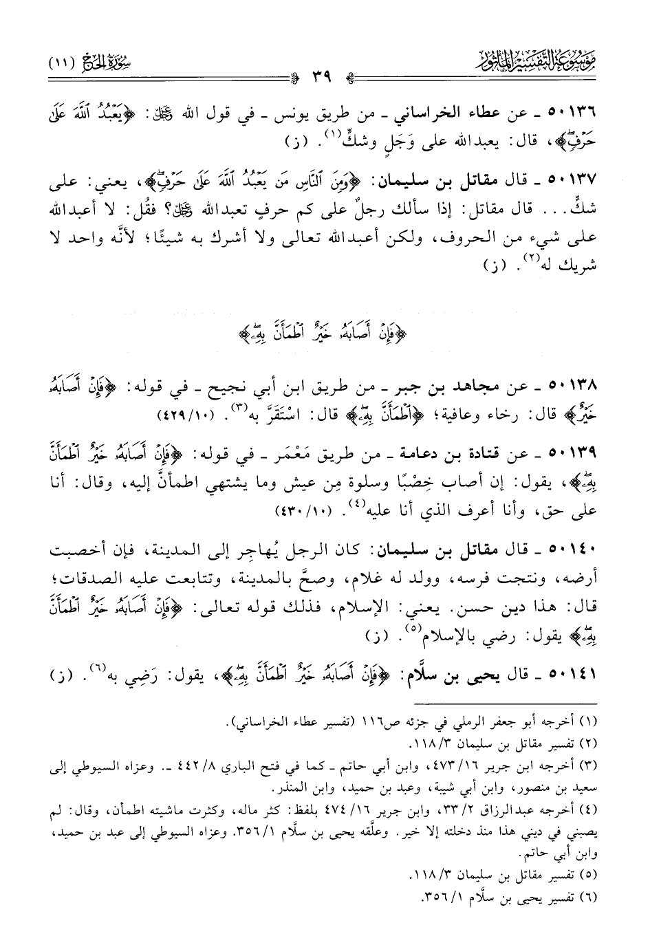 ٥٠١٣٨ - عن مجاهد بن جبر -من طريق ابن أبي نجيح- في قوله: {فان أصابه خير} قال: رخاء وعافية؛ {اطمأن به} قال: اسْتَقَرَّ به (¬٣). (١٠/ ٤٢٩)