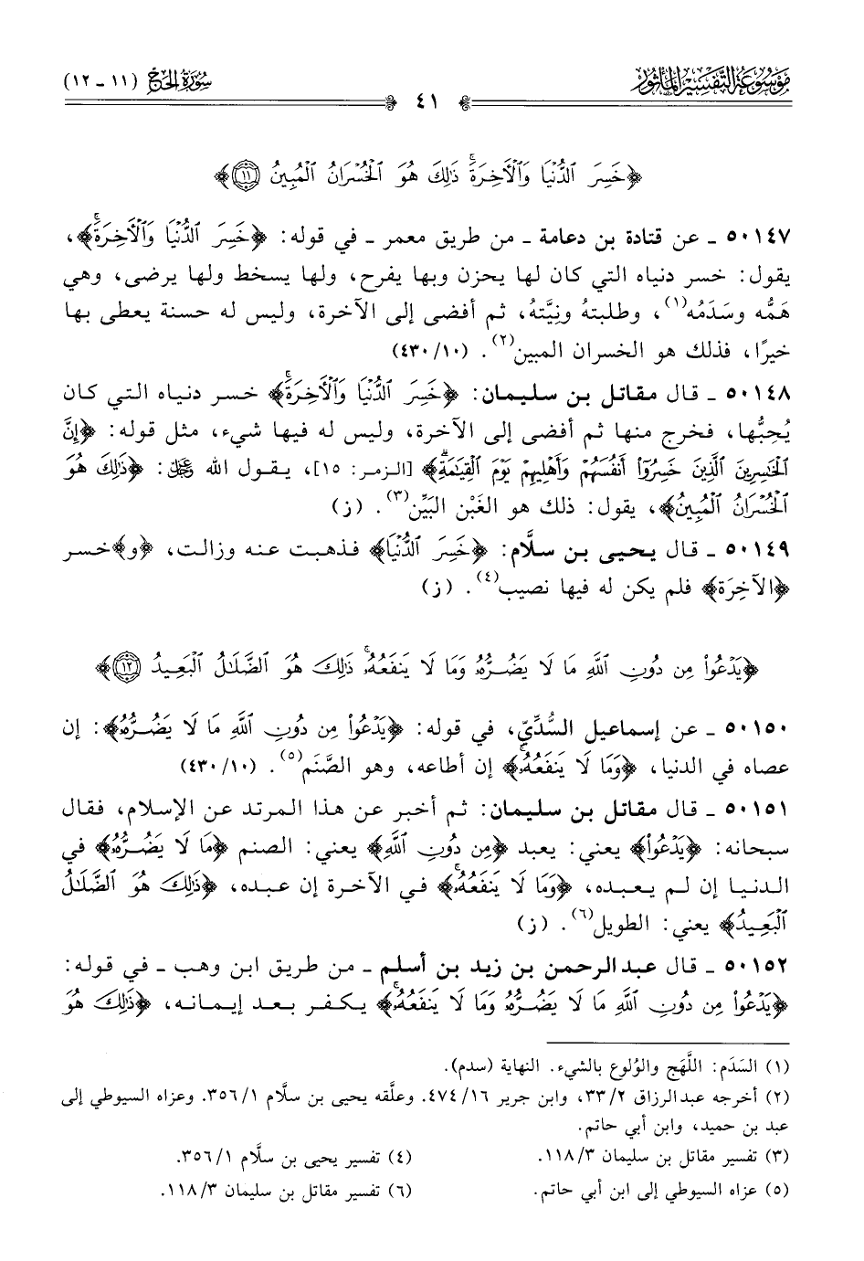 ٥٠١٥٢ - قال عبد الرحمن بن زيد بن أسلم -من طريق ابن وهب- في قوله: {يدعو من دون الله ما لا يضره وما لا ينفعه} يكفر بعد إيمانه، {ذلك هو