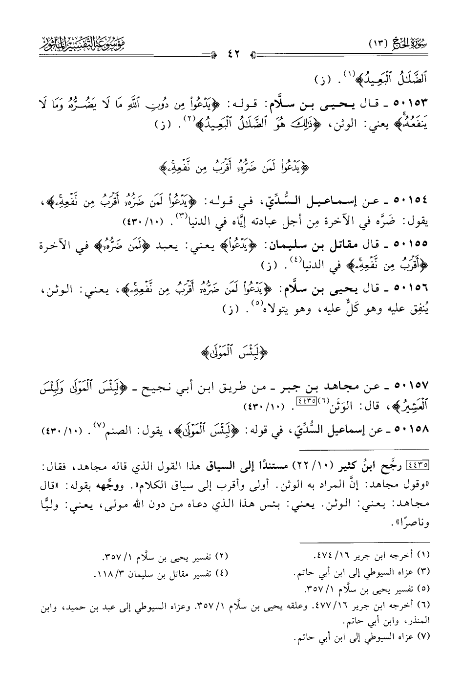 ٥٠١٥٣ - قال يحيى بن سلّام: قوله: {يدعو من دون الله ما لا يضره وما لا ينفعه} يعني: الوثن، {ذلك هو الضلال البعيد} (¬٢). (ز)