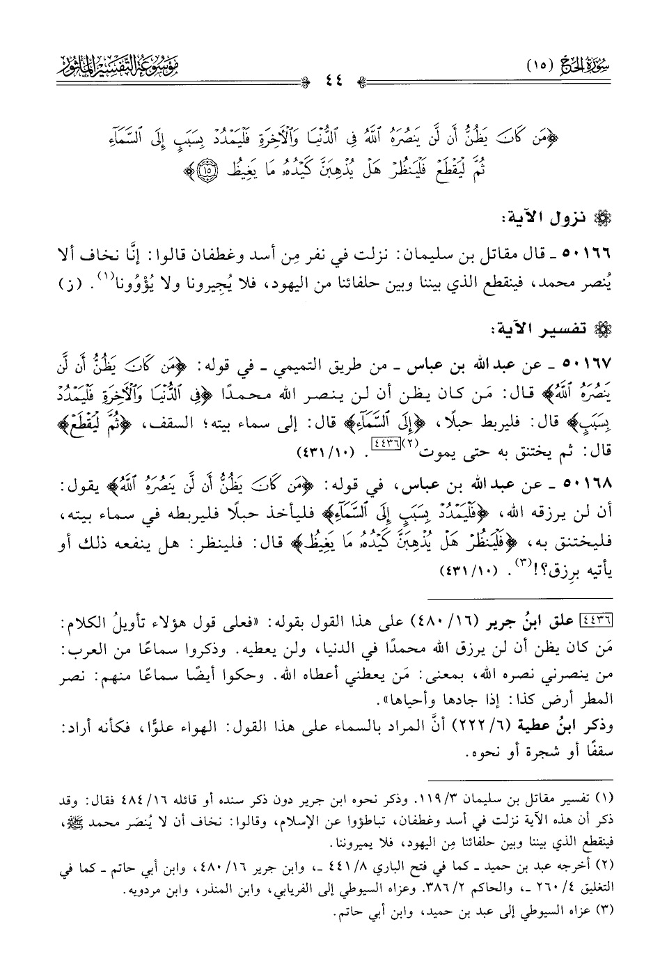 ٥٠١٦٧ - عن عبد الله بن عباس -من طريق التميمي- في قوله: {من كان يظن أن لن ينصره الله} قال: مَن كان يظن أن لن ينصر الله محمدًا {في الدنيا والآخرة فليمدد بسبب} قال: فليربط حبلًا، {إلى السماء} قال: إلى سماء بيته؛ السقف، {ثم ليقطع} قال: ثم يختنق به حتى يموت (¬٢) [٤٤٣٦]. (١٠/ ٤٣١)