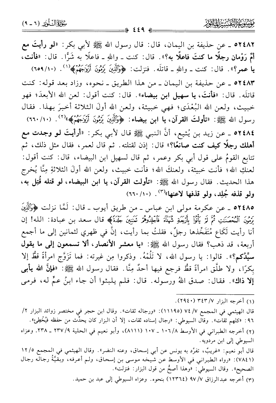 ٥٢٤٨٢ - عن حذيفة بن اليمان، قال: قال رسول الله - صلى الله عليه وسلم - لأبي بكر: «لو رأيتَ مع أمِّ رَوْمان رجلًا ما كنتَ فاعلًا به؟». قال: كنت -واللهِ- فاعلًا به شَرًّا. قال: «فأنت، يا عمر؟». قال: كنت -واللهِ- قاتلَه. فنزلت: {والذين يرمون أزواجهم} (¬١). (١٠/ ٦٥٩)