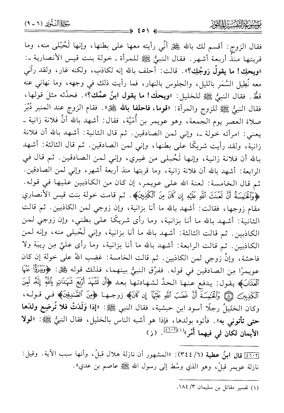 فقال الزوج: أقسم لك بالله - عز وجل - أنِّي رأيته معها على بطنها، وإنها لَحُبْلى منه، وما قربتها منذُ أربعة أشهر. فقال النبيُّ - صلى الله عليه وسلم - للمرأة -خولة بنت قيس الأنصارية-: «ويحكِ! ما يقولُ زوجُكِ؟». قالت: أحلف بالله إنه لكاذب، ولكنه غار، ولقد رآني معه نُطِيل السَّمَر بالليل، والجلوس بالنهار، فما رأيت ذلك في وجهه، وما نهاني عنه قطُّ. فقال النبيُّ - صلى الله عليه وسلم - للخليل: «ويحكَ! ما يقول ابنُ عمِّك؟». فحدَّثه مثلَ قولها، فقال النبيُّ - صلى الله عليه وسلم - للزوج والمرأة: «قوما، فاحلفا بالله - عز وجل -». فقام الزوج عند المنبر دُبُرَ صلاة العصر يوم الجمعة، وهو عويمر بن أُمَيَّة، فقال: أشهد بالله أنّ فلانة زانية -يعني: امرأته خولة-، وإني لمن الصادقين. ثم قال الثانية: أشهد بالله أن فلانة زانية، ولقد رأيت شريكًا على بطنها، وإني لمن الصادقين. ثم قال الثالثة: أشهد بالله أن فلانة زانية، وإنها لَحُبلى من غيري، وإني لمن الصادقين. ثم قال في الرابعة: أشهد بالله أن فلانة زانية، وما قربتها منذ أربعة أشهر، وإني لمن الصادقين. ثم قال الخامسة: لعنة الله على عويمر، إن كان من الكاذبين عليها في قوله. {والخامسة أن لعنة الله عليه إن كان من الكاذبين}. ثم قامت خولة بنت قيس الأنصاري مقام زوجها، فقالت: أشهد بالله ما أنا بزانية، وإن زوجي لمن الكاذبين. ثم قالت الثانية: أشهد بالله ما أنا بزانية، وما رأى شريكًا على بطني، وإن زوجي لمن الكاذبين. ثم قالت الثالثة: أشهد بالله ما أنا بزانية، وإني لَحُبلى منه، وإنه لمن الكاذبين. ثم قالت الرابعة: أشهد بالله ما أنا بزانية، وما رأى عليَّ مِن رِيبَة ولا فاحشة، وإنّ زوجي لمن الكاذبين. ثم قالت الخامسة: غضِب اللهُ على خولة إن كان عويمرًا مِن الصادقين في قوله. ففرَّق النبيُّ بينهما، فذلك قوله - عز وجل -: {ويدرؤا عنها العذاب} يقول: يدفع عنها الحدَّ لشهادتها بعد {أن تشهد أربع شهادات بالله إنه لمن الكاذبين والخامسة أن غضب الله عليها إن كان} زوجها {من الصادقين} في قوله، وكان الخليلُ رجلًا أسود ابن حبشية، فقال النبي - صلى الله عليه وسلم -: «إذا ولَدَتْ فلا تُرضِع ولدَها حتى تأتوني به». فأتوه بولدها، فإذا هو أشبه الناس بالخليل، فقال النبيُّ - صلى الله عليه وسلم -: «لولا الأيمان لكان لي فيهما أمْر» (¬١) [٤٦٠٢]. (ز)