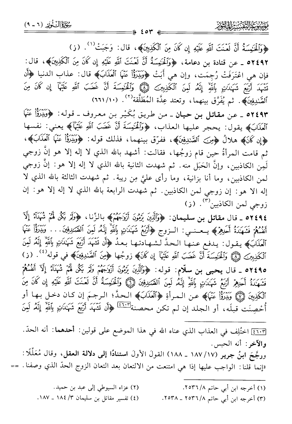 ٥٢٤٩٣ - عن مقاتل بن حيان -من طريق بُكَيْر بن معروف- قوله: {ويدرأ عنها العذاب} يقول: يحجر عليها العذاب، {والخامسة أن غضب الله عليها} يعني: نفسها {إن كان} هلالُ {من الصادقين}، ففرّق بينهما، فذلك قوله: {ويدرأ عنها العذاب}، ثم قامت المرأةُ حين قام زوجُها، فقالت: أشهد بالله الذي لا إله إلا هو إنّ زوجي لَمِن الكاذبين، وإنّ الحَبَل منه. ثم شهدت الثانية بالله الذي لا إله إلا هو: إنّ زوجي لمن الكاذبين، وما أنا بزانية، وما رأى عليَّ مِن ريبة. ثم شهدت الثالثة بالله الذي لا إله الا هو: إن زوجي لمن الكاذبين. ثم شهدت الرابعة بالله الذي لا إله إلا هو: إن زوجي لمن الكاذبين (¬٣). (ز)