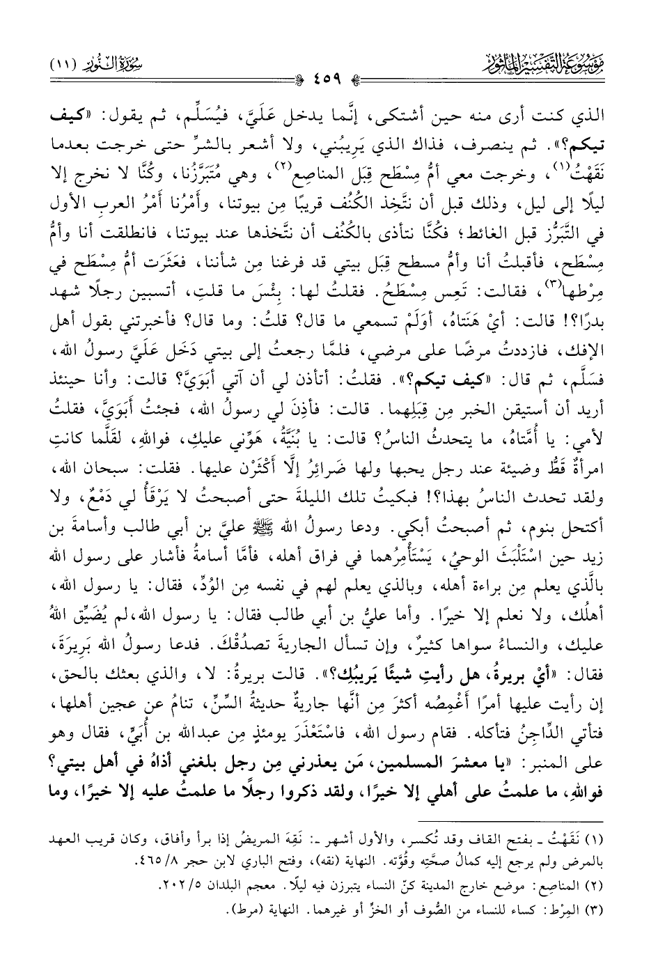 الذي كنت أرى منه حين أشتكى، إنّما يدخل عَلَيَّ، فيُسَلِّم، ثم يقول: «كيف تيكم؟». ثم ينصرف، فذاك الذي يَرِيبُني، ولا أشعر بالشرِّ حتى خرجت بعدما نَقَهْتُ (¬١)، وخرجت معي أمُّ مِسْطَح قِبَل المناصِع (¬٢)، وهي مُتَبَرَّزُنا، وكُنّا لا نخرج إلا ليلًا إلى ليل، وذلك قبل أن نتَّخِذ الكُنُف قريبًا مِن بيوتنا، وأَمْرُنا أمْرُ العربِ الأول في التَّبَرُّز قبل الغائط؛ فكُنّا نتأذى بالكُنُف أن نتَّخذها عند بيوتنا، فانطلقت أنا وأمُّ مِسْطَح، فأقبلتُ أنا وأمُّ مسطح قِبَل بيتي قد فرغنا مِن شأننا، فعَثَرَت أمُّ مِسْطَح في مِرْطها (¬٣)، فقالت: تَعِس مِسْطَحُ. فقلتُ لها: بِئْسَ ما قلتِ، أتسبين رجلًا شهد بدرًا؟! قالت: أيْ هَنَتاهُ، أوَلَمْ تسمعي ما قال؟ قلتُ: وما قال؟ فأخبرتني بقول أهل الإفك، فازددتُ مرضًا على مرضي، فلمّا رجعتُ إلى بيتي دَخَل عَلَيَّ رسولُ الله - صلى الله عليه وسلم -، فسَلَّم، ثم قال: «كيف تيكم؟». فقلتُ: أتأذن لي أن آتي أبَوَيَّ؟ قالت: وأنا حينئذ أريد أن أستيقن الخبر مِن قِبَلِهما. قالت: فأذِنَ لي رسولُ الله - صلى الله عليه وسلم -، فجئتُ أبَوَيَّ، فقلتُ لأمي: يا أُمَّتاهُ، ما يتحدثُ الناسُ؟ قالت: يا بُنَيَّةُ، هَوِّني عليكِ، فواللهِ، لقَلَّما كانتِ امرأةٌ قَطُّ وضيئة عند رجل يحبها ولها ضَرائِرُ إلّا أكْثَرْن عليها. فقلت: سبحان الله، ولقد تحدث الناسُ بهذا؟! فبكيتُ تلك الليلةَ حتى أصبحتُ لا يَرْقَأُ لي دَمْعٌ، ولا أكتحل بنوم، ثم أصبحتُ أبكي. ودعا رسولُ الله - صلى الله عليه وسلم - عليَّ بن أبي طالب وأسامةَ بن زيد حين اسْتَلْبَثَ الوحيُ، يَسْتَأْمِرُهما في فراق أهله، فأمّا أسامةُ فأشار على رسول الله - صلى الله عليه وسلم - بالَّذي يعلم مِن براءة أهله، وبالذي يعلم لهم في نفسه مِن الوُدِّ، فقال: يا رسول الله، أهلُك، ولا نعلم إلا خيرًا. وأما عليُّ بن أبي طالب فقال: يا رسول الله، لم يُضَيِّق اللهُ عليك، والنساءُ سواها كثيرٌ، وإن تسأل الجاريةَ تصدُقْكَ. فدعا رسولُ الله - صلى الله عليه وسلم - بَرِيرَةَ، فقال: «أيْ بريرةُ، هل رأيتِ شيئًا يَريبُكِ؟». قالت بريرةُ: لا، والذي بعثك بالحق، إن رأيت عليها أمرًا أغْمِصُه أكثرَ مِن أنّها جاريةٌ حديثةُ السِّنِّ، تنامُ عن عجين أهلها، فتأتي الدِّاجِنُ فتأكله. فقام رسول الله - صلى الله عليه وسلم -، فاسْتَعْذَرَ يومئذٍ مِن عبد الله بن أُبَيٍّ، فقال وهو على المنبر: «يا معشرَ المسلمين، مَن يعذرني مِن رجل بلغني أذاهُ في أهل بيتي؟ فواللهِ، ما علمتُ على أهلي إلا خيرًا، ولقد ذكروا رجلًا ما علمتُ عليه إلا خيرًا، وما