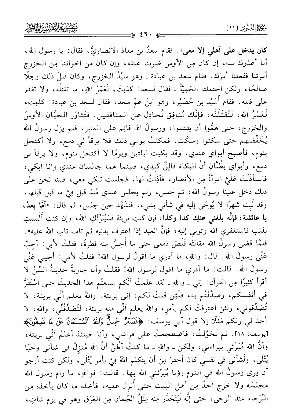 كان يدخل على أهلي إلا معي». فقام سعدُ بن معاذ الأنصاريُّ، فقال: يا رسول الله، أنا أعذرك منه، إن كان مِن الأوس ضربنا عنقه، وإن كان من إخواننا مِن الخزرج أمرتنا ففعلنا أمرَك. فقام سعد بن عبادة -وهو سيِّدُ الخزرج، وكان قبلَ ذلك رجلًا صالحًا، ولكن احتملته الحَمِيَّةُ- فقال لسعد: كذبتَ، لَعَمْرُ اللهِ، ما تقتلُه، ولا تقدر على قتله. فقام أُسَيْد بن حُضَيْر، وهو ابنُ عمِّ سعد، فقال لسعد بن عبادة: كذبتَ، لَعَمْرُ الله، لنَقْتُلَنَّه، فإنّك مُنافِق تُجادِل عن المنافقين. فتَثاوَر الحيّانِ الأوسُ والخزرج، حتى همُّوا أن يقتتلوا، ورسولُ الله - صلى الله عليه وسلم - قائِم على المنبر، فلم يزل رسولُ الله - صلى الله عليه وسلم - يُخَفِّضهم حتى سكتوا وسَكَت. فمكثتُ يومي ذلك فلا يرقأ لي دمع، ولا أكتحل بنوم، فأصبح أبواي عندي، وقد بكيت ليلتين ويومًا لا أكتحل بنوم، ولا يرقأ لي دمع، وأبواي يظُنّانِ أنّ البكاءَ فالِقٌ كَبِدِي، فبينما هما جالسان عندي وأنا أبكي، فاستأذَنَتْ عَلَيَّ امرأةٌ مِن الأنصار، فأذِنتُ لها، فجلست تبكي معي، فبينا نحن على ذلك دخل علينا رسولُ الله - صلى الله عليه وسلم -، ثم جلس، ولم يجلس عندي مُنذ قيل فِيَّ ما قيل قبلها، وقد لَبِث شهرًا لا يُوحى إليه في شأني بشيء، فتَشَهَّد حين جلس، ثم قال: «أمّا بعدُ، يا عائشة، فإنّه بلغني عنكِ كذا وكذا، فإن كنتِ بريئة فسَيُبَرِّئُكِ اللهُ، وإن كنتِ ألْممتِ بذنب فاستغفري الله وتوبي إليه؛ فإنّ العبد إذا اعترف بذنبه ثم تاب تاب اللهُ عليه». فلمّا قضى رسولُ الله - صلى الله عليه وسلم - مقالتَه قَلَصَ دمعي حتى ما أُحِسُّ منه قطرةً، فقلتُ لأبي: أجِبْ عَنِّي رسولَ الله - صلى الله عليه وسلم -. قال: واللهِ، ما أدري ما أقولُ لرسول الله - صلى الله عليه وسلم -! فقلتُ لأمي: أجيبي عَنِّي رسولَ الله - صلى الله عليه وسلم -. قالت: ما أدري ما أقول لرسول الله - صلى الله عليه وسلم -! فقلتُ وأنا جاريةٌ حديثةُ السِّنِّ لا أقرأ كثيرًا مِن القرآن: إني -واللهِ- لقد علمتُ أنّكم سمعتُم هذا الحديثَ حتى اسْتَقَرَّ في أنفسكم، وصدَّقْتُم به، فلَئِن قلتُ لكم: إني بريئة. واللهُ يعلم أنِّي بريئة، لا تُصَدِّقوني، ولئن اعترفتُ لكم بأمرٍ، واللهُ يعلم أنِّي منه بريئة، لتُصَدِّقُنِّي، واللهِ، لا أجد لي ولكم مَثَلًا إلا قول أبي يوسف: {فصبر جميل والله المستعان على ما تصفون} [يوسف: ١٨]. ثم تَحَوَّلتُ، فاضطجعتُ على فراشي، وأنا حينئذ أعلمُ أنِّي بريئة، وأنّ الله مُبَرِّئي ببراءتي، ولكن -واللهِ- ما كنتُ أظُنَّ أنّ الله مُنزِلٌ في شأني وحيًا يُتْلى، ولَشأني في نفسي كان أحقرَ مِن أن يتكلم اللهُ فِيَّ بأمر يُتْلى، ولكن كنت أرجو أن يرى رسولُ الله - صلى الله عليه وسلم - في النوم رؤيا يُبَرِّئني الله بها. قالت: فواللهِ، ما رام رسول الله - صلى الله عليه وسلم - مجلسَه ولا خرج أحدٌ مِن أهل البيت حتى أُنزِل عليه، فأخذه ما كان يأخذه مِن البُرَحاء عند الوحي، حتى إنّه لَيَتَحَدَّر مِنه مِثْلُ الجُمانِ مِن العَرَق وهو في يوم شاتٍ،
