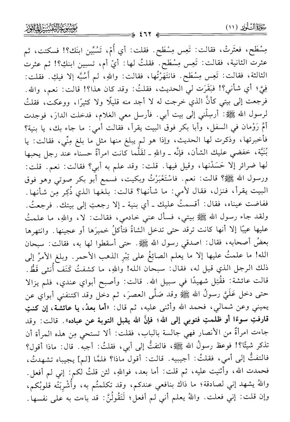 مِسْطَح، فعثَرتْ، فقالت: تَعِس مِسْطَح. فقلت: أي أُمّ، تَسُبِّين ابنَك؟! فسكتت، ثم عثرت الثانية، فقالت: تَعِس مِسْطَح. فقلتُ لها: أيْ أم، تسبين ابنكِ؟! ثم عثرت الثالثة، فقالت: تَعِس مِسْطَح. فانتَهَرْتُها، فقالت: واللهِ، لم أسُبَّه إلا فيكِ. فقلت: فِيَّ؛ أي شأني؟! فبَقَرَت لي الحديث، فقلتُ: وقد كان هذا؟! قالت: نعم، والله. فرجعت إلى بيتي كأنّ الذي خرجت له لا أجد منه قليلًا ولا كثيرًا، ووعكت، فقلتُ لرسول الله - صلى الله عليه وسلم -: أرسِلْني إلى بيت أبي. فأرسل معي الغلام، فدخلت الدارَ، فوجدت أمَّ رَوْمان في السفل، وأبا بكر فوق البيت يقرأ، فقالت أمي: ما جاء بك، يا بنية؟ فأخبرتها، وذكرت لها الحديث، وإذا هو لم يبلغ منها مثل ما بلغ مِنِّي، فقالت: يا بُنَيَّة، خفضي عليك الشأن، فإنّه -واللهِ- لقَلَّما كانت امرأةٌ حسناء عند رجل يحبها لها ضرائر إلا حَسَدْنها، وقيل فيها. قلت: وقد علم به أبي؟ فقالت: نعم. قلت: ورسول الله - صلى الله عليه وسلم -؟ قالت: نعم. فاسْتَعْبَرْتُ وبكيت، فسمع أبو بكر صوتي وهو فوق البيت يقرأ، فنزل، فقال لأمي: ما شأنها؟ قالت: بلغها الذي ذُكِر مِن شأنها. ففاضت عيناه، فقال: أقسمتُ عليك -أي بنية- إلا رجعتِ إلى بيتك. فرجعتُ. ولقد جاء رسول الله - صلى الله عليه وسلم - بيتي، فسأل عني خادمي، فقالت: لا، واللهِ، ما علمتُ عليها عيبًا إلا أنها كانت ترقد حتى تدخل الشاةُ فتأكلُ خميرَها أو عجينها. وانتهرها بعضُ أصحابه، فقال: اصدقي رسول الله - صلى الله عليه وسلم -. حتى أسقطوا لها به، فقالت: سبحان الله! ما علمتُ عليها إلا ما يعلم الصائِغُ على تِبْرِ الذهب الأحمر. وبلغ الأمرُ إلى ذلك الرجل الذي قيل له، فقال: سبحان الله! واللهِ، ما كشفتُ كَنَف أُنثى قَطُّ. قالت عائشة: فقُتِل شهيدًا في سبيل الله. قالت: وأصبح أبواي عندي، فلم يزالا حتى دخل عَلَيَّ رسولُ الله - صلى الله عليه وسلم - وقد صَلّى العصرَ، ثم دخل وقد اكتنفني أبواي عن يميني وعن شمالي، فحمد الله وأثنى عليه، ثم قال: «أما بعدُ، يا عائشة، إن كنتِ قارفتِ سوءًا أو ظلمتِ فتوبي إلى الله؛ فإنّ الله يقبل التوبة عن عباده». قالت: وقد جاءت امرأةٌ من الأنصار فهي جالسة بالباب، فقلت: ألا تستحي مِن هذه المرأة أن تذكر شيئًا؟! فوعظ رسولُ الله - صلى الله عليه وسلم -، فالتفتُّ إلى أبي، فقلتُ: أجبه. قال: ماذا أقول؟ فالتفتُّ إلى أمي، فقلتُ: أجيبيه. قالت: أقول ماذا؟ فلمّا [لم] يجيباه تشهدتُ، فحمدت الله، وأثنيت عليه، ثم قلت: أما بعد، فواللهِ، لئن قلتُ لكم: إني لم أفعل. واللهُ يشهد إني لصادقة؛ ما ذاك بنافعي عندكم، وقد تكلمتُم به، وأُشْرِبَتْه قلوبُكم، وإن قلت: إني فعلت. واللهُ يعلم أني لم أفعل؛ لَتَقُولُنَّ: قد باءت به على نفسها.