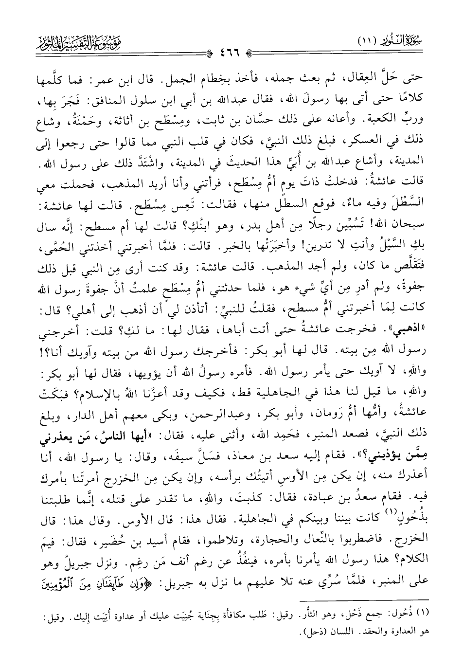 حتى حَلَّ العِقال، ثم بعث جمله، فأخذ بخِطام الجمل. قال ابن عمر: فما كلَّمها كلامًا حتى أتى بها رسولَ الله - صلى الله عليه وسلم -، فقال عبد الله بن أبي بن سلول المنافق: فَجَرَ بِها، وربِّ الكعبة. وأعانه على ذلك حسّان بن ثابت، ومِسْطَح بن أثاثة، وحَمْنَةُ، وشاع ذلك في العسكر، فبلغ ذلك النبيَّ - صلى الله عليه وسلم -، فكان في قلب النبي - صلى الله عليه وسلم - مما قالوا حتى رجعوا إلى المدينة، وأشاع عبدُ الله بن أُبَيٍّ هذا الحديثَ في المدينة، واشْتَدَّ ذلك على رسول الله - صلى الله عليه وسلم -. قالت عائشةُ: فدخلتْ ذاتَ يومٍ أمُّ مِسْطَح، فرأتني وأنا أريد المذهب، فحملت معي السَّطْلَ وفيه ماءٌ، فوقع السطل منها، فقالت: تَعِس مِسْطَح. قالت لها عائشة: سبحان الله! تَسُبِّين رجلًا مِن أهل بدر، وهو ابنُكِ؟ قالت لها أم مسطح: إنّه سال بكِ السَّيْلُ وأنتِ لا تدرين! وأخبَرَتْها بالخبر. قالت: فلمّا أخبرتني أخذتني الحُمّى، فتَقَلَّص ما كان، ولم أجد المذهب. قالت عائشة: وقد كنت أرى مِن النبي - صلى الله عليه وسلم - قبل ذلك جفوةً، ولم أدرِ مِن أيِّ شيء هو، فلما حدثتني أمُّ مِسْطَحٍ علمتُ أنّ جفوةَ رسول الله - صلى الله عليه وسلم - كانت لِما أخبرتني أمُّ مسطح، فقلتُ للنبيِّ - صلى الله عليه وسلم -: أتأذن لي أن أذهب إلى أهلي؟ قال: «اذهبي». فخرجت عائشةُ حتى أتت أباها، فقال لها: ما لكِ؟ قلت: أخرجني رسول الله - صلى الله عليه وسلم - مِن بيته. قال لها أبو بكر: فأخرجك رسول الله - صلى الله عليه وسلم - من بيته وآويك أنا؟! واللهِ، لا آويك حتى يأمر رسول الله - صلى الله عليه وسلم -. فأمره رسولُ الله - صلى الله عليه وسلم - أن يؤويها، فقال لها أبو بكر: واللهِ، ما قيل لنا هذا في الجاهلية قط، فكيف وقد أعزَّنا اللهُ بالإسلام؟ فبَكَتْ عائشةُ، وأمُّها أمُّ رَومان، وأبو بكر، وعبد الرحمن، وبكى معهم أهل الدار، وبلغ ذلك النبيَّ - صلى الله عليه وسلم -، فصعد المنبر، فحَمِد الله، وأثنى عليه، فقال: «أيها الناسُ، مَن يعذرني مِمَّن يؤذيني؟». فقام إليه سعد بن معاذ، فسَلَّ سيفَه، وقال: يا رسول الله، أنا أعذرك منه، إن يكن مِن الأوسِ أتيتُك برأسه، وإن يكن مِن الخزرج أمرتَنا بأمرك فيه. فقام سعدُ بن عبادة، فقال: كذبتَ، واللهِ، ما تقدر على قتله، إنّما طلبتنا بذُحُولٍ (¬١) كانت بيننا وبينكم في الجاهلية. فقال هذا: قال الأوس. وقال هذا: قال الخزرج. فاضطربوا بالنِّعال والحجارة، وتلاطموا، فقام أسيد بن حُضَير، فقال: فيمَ الكلام؟ هذا رسول الله يأمرنا بأمره، فينفُذُ عن رغم أنف مَن رغِم. ونزل جبريلُ وهو على المنبر، فلمّا سُرِّي عنه تلا عليهم ما نزل به جبريل: {وان طائفتان من المؤمنين