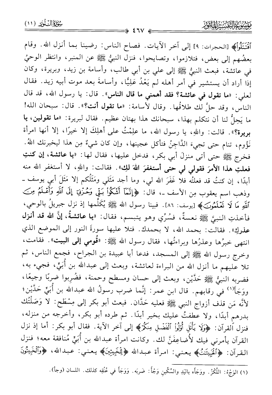 اقتتلوا} [الحجرات: ٩] إلى آخر الآيات. فصاح الناس: رضينا بما أنزل الله. وقام بعضُهم إلى بعض، فتلازموا، وتصايحوا، فنزل النبيُّ - صلى الله عليه وسلم - عن المنبر، وانتظر الوحيُ في عائشة، فبعث النبيُّ - صلى الله عليه وسلم - إلى علي بن أبي طالب، وأسامة بن زيد، وبريرة، وكان إذا أراد أن يستشير في أمر أهله لم يَعْدُ عَلِيًّا، وأسامةَ بعد موت أبيه زيد. فقال لعلي: «ما تقول في عائشة؟ فقد أهمني ما قال الناس». قال: يا رسول الله، قد قال الناس، وقد حلَّ لك طلاقُها. وقال لأسامة: «ما تقول أنت؟». قال: سبحان الله! ما يَحِلُّ لنا أن نتكلم بهذا، سبحانك هذا بهتان عظيم. فقال لبريرة: «ما تقولين، يا بريرة؟». قالت: واللهِ، يا رسول الله، ما علِمْتُ على أهلِكَ إلا خيرًا، إلا أنها امرأة نَؤُوم، تنام حتى تجيءَ الدّاجِنُ فتأكل عجينها، وإن كان شيءٌ مِن هذا ليخبرنك اللهُ. فخرج - صلى الله عليه وسلم - حتى أتى منزلَ أبي بكر، فدخل عليها، فقال لها: «يا عائشة، إن كنتِ فعلتِ هذا الأمرَ فقولي لي حتى أستغفرَ اللهَ لكِ». فقالت: واللهِ، لا أستغفر الله منه أبدًا، إن كنتُ قد فعلتُه فلا غَفَرَ الله لي، وما أجد مَثَلي ومَثَلُكم إلا مَثَلَ أبي يوسف -وذهب اسم يعقوب مِن الأسف-، قال: {انما أشكوا بثي وحزني إلى الله وأعلم من الله ما لا تعلمون} [يوسف: ٨٦]. فبينا رسول الله - صلى الله عليه وسلم - يُكَلِّمها إذ نزل جبريلُ بالوحي، فأخذتِ النبيَّ - صلى الله عليه وسلم - نعسةٌ، فسُرِّي وهو يتبسم، فقال: «يا عائشةُ، إنّ الله قد أنزل عذركِ». فقالت: بحمد الله، لا بحمدك. فتلا عليها سورةَ النور إلى الموضع الذي انتهى خبرُها وعذرُها وبراءتُها، فقال رسول الله - صلى الله عليه وسلم -: «قُومي إلى البيت». فقامت، وخرج رسول الله - صلى الله عليه وسلم - إلى المسجد، فدعا أبا عبيدة بن الجراح، فجمع الناس، ثم تلا عليهم ما أنزل الله من البراءة لعائشة، وبعث إلى عبد الله بن أُبَيٍّ، فجيء به، فضربه النبيُّ - صلى الله عليه وسلم - حَدَّيْن، وبعث إلى حسان ومسطح وحمنة، فضُرِبوا ضربًا وجيعًا، ووَجَأَ (¬١) في رقابهم. قال ابن عمر: إنّما ضرب رسولُ الله - صلى الله عليه وسلم - عبد الله بن أُبَيٍّ حَدَّيْن؛ لأنّه مَن قذف أزواج النبي - صلى الله عليه وسلم - فعليه حَدّان. فبعث أبو بكر إلى مِسْطَح: لا وصَلْتُك بدرهمٍ أبدًا، ولا عطفتُ عليك بخير أبدًا. ثم طرده أبو بكر، وأخرجه من منزله، فنزل القرآن: {ولا يأتل أولوا الفضل منكم} إلى آخر الآية. فقال أبو بكر: أما إذ نزل القرآن يأمرني فيك لأُضاعِفَنَّ لك. وكانت امرأة عبد الله بن أُبَيٍّ مُنافقة معه؛ فنزل القرآن: {الخبيثات} يعني: امرأة عبد الله {للخبيثين} يعني: عبد الله، {والخبيثون