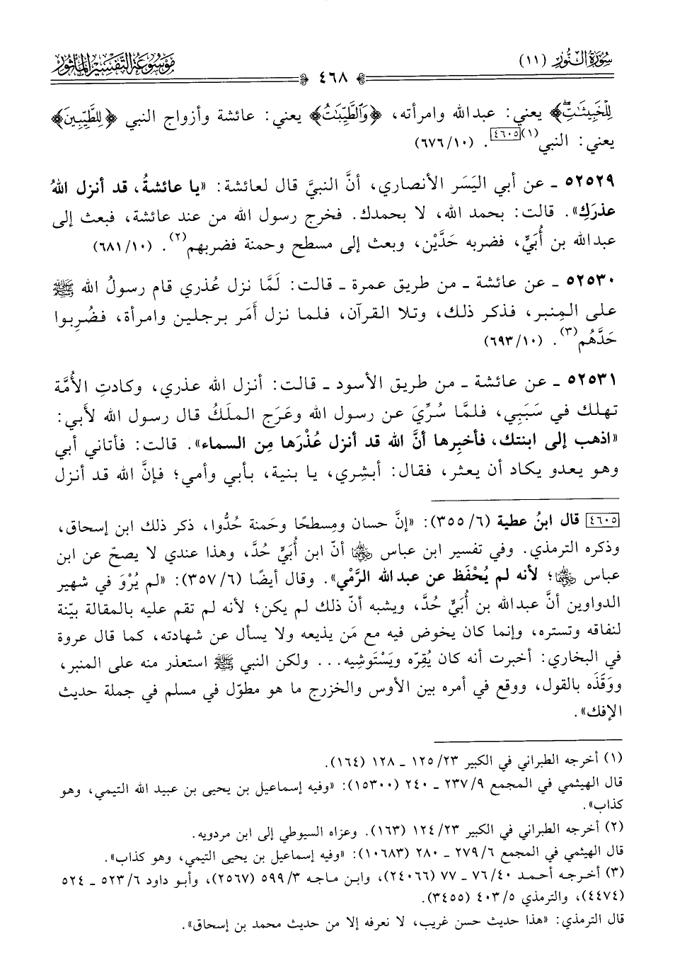 [٤٦٠٥] قال ابنُ عطية (٦/ ٣٥٥): «إنّ حسان ومِسطحًا وحَمنة حُدُّوا، ذكر ذلك ابن إسحاق، وذكره الترمذي. وفي تفسير ابن عباس - رضي الله عنهما - أنّ ابن أُبَيٍّ حُدَّ، وهذا عندي لا يصحّ عن ابن عباس - رضي الله عنهما -؛ لأنه لم يُحْفَظ عن عبد الله الرَّمْي». وقال أيضًا (٦/ ٣٥٧): «لم يُرْوَ في شهير الدواوين أنّ عبد الله بن أُبَيٍّ حُدَّ، ويشبه أنّ ذلك لم يكن؛ لأنه لم تقم عليه بالمقالة بيّنة لنفاقه وتستره، وإنما كان يخوض فيه مع مَن يذيعه ولا يسأل عن شهادته، كما قال عروة في البخاري: أخبرت أنه كان يُقِرّه ويَسْتَوشِيه ... ولكن النبي - صلى الله عليه وسلم - استعذر منه على المنبر، ووَقَذَه بالقول، ووقع في أمره بين الأوس والخزرج ما هو مطوّل في مسلم في جملة حديث الإفك».