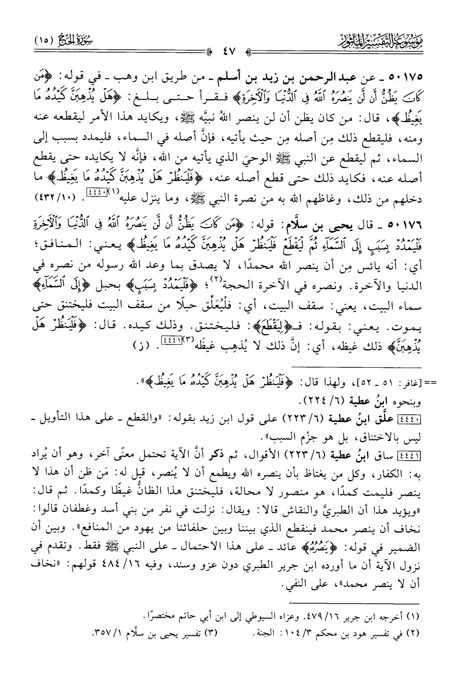٥٠١٧٥ - عن عبد الرحمن بن زيد بن أسلم -من طريق ابن وهب- في قوله: {من كان يظن أن لن ينصره الله في الدنيا والآخرة} فقرأ حتى بلغ: {هل يذهبن كيده ما يغيظ}، قال: من كان يظن أن لن ينصر اللهُ نبيَّه - صلى الله عليه وسلم -، ويكايد هذا الأمر ليقطعه عنه ومنه، فليقطع ذلك مِن أصله مِن حيث يأتيه، فإنّ أصله في السماء، فليمدد بسبب إلى السماء، ثم ليقطع عن النبي - صلى الله عليه وسلم - الوحيَ الذي يأتيه من الله، فإنّه لا يكايده حتى يقطع أصله عنه، فكايد ذلك حتى قطع أصله عنه، {فلينظر هل يذهبن كيده ما يغيظ} ما دخلهم من ذلك، وغاظهم الله به من نصرة النبي - صلى الله عليه وسلم -، وما ينزل عليه (¬١) [٤٤٤٠]. (١٠/ ٤٣٢)