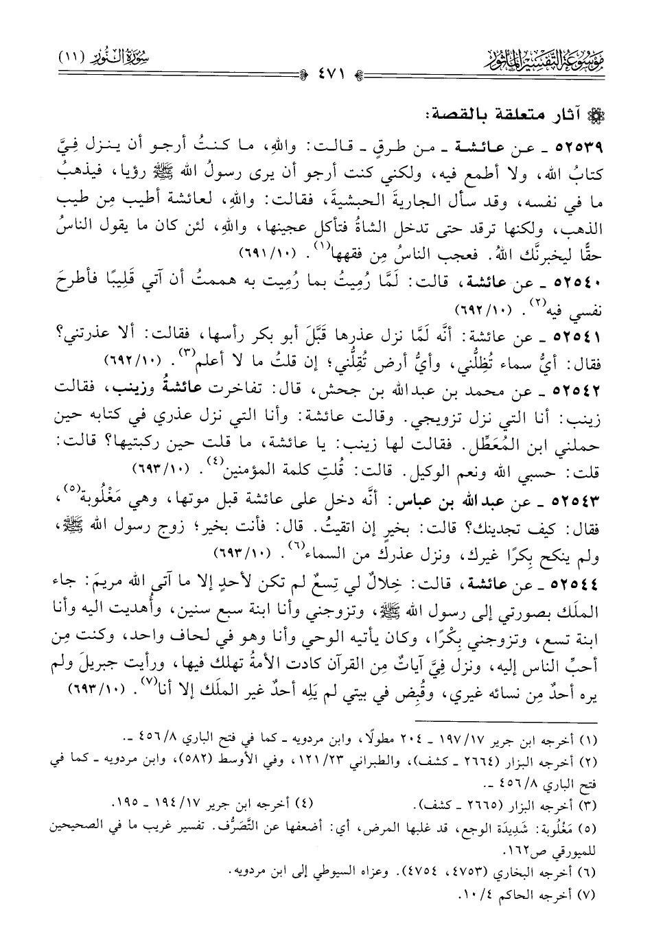 ٥٢٥٣٩ - عن عائشة -من طرقٍ- قالت: واللهِ، ما كنتُ أرجو أن ينزل فِيَّ كتابُ الله، ولا أطمع فيه، ولكني كنت أرجو أن يرى رسولُ الله - صلى الله عليه وسلم - رؤيا، فيذهبُ ما في نفسه، وقد سأل الجاريةَ الحبشيةَ، فقالت: واللهِ، لعائشة أطيب مِن طيب الذهب، ولكنها ترقد حتى تدخل الشاةُ فتأكل عجينها، واللهِ، لئن كان ما يقول الناسُ حقًّا ليخبرنَّك اللهُ. فعجب الناسُ مِن فقهها (¬١). (١٠/ ٦٩١)