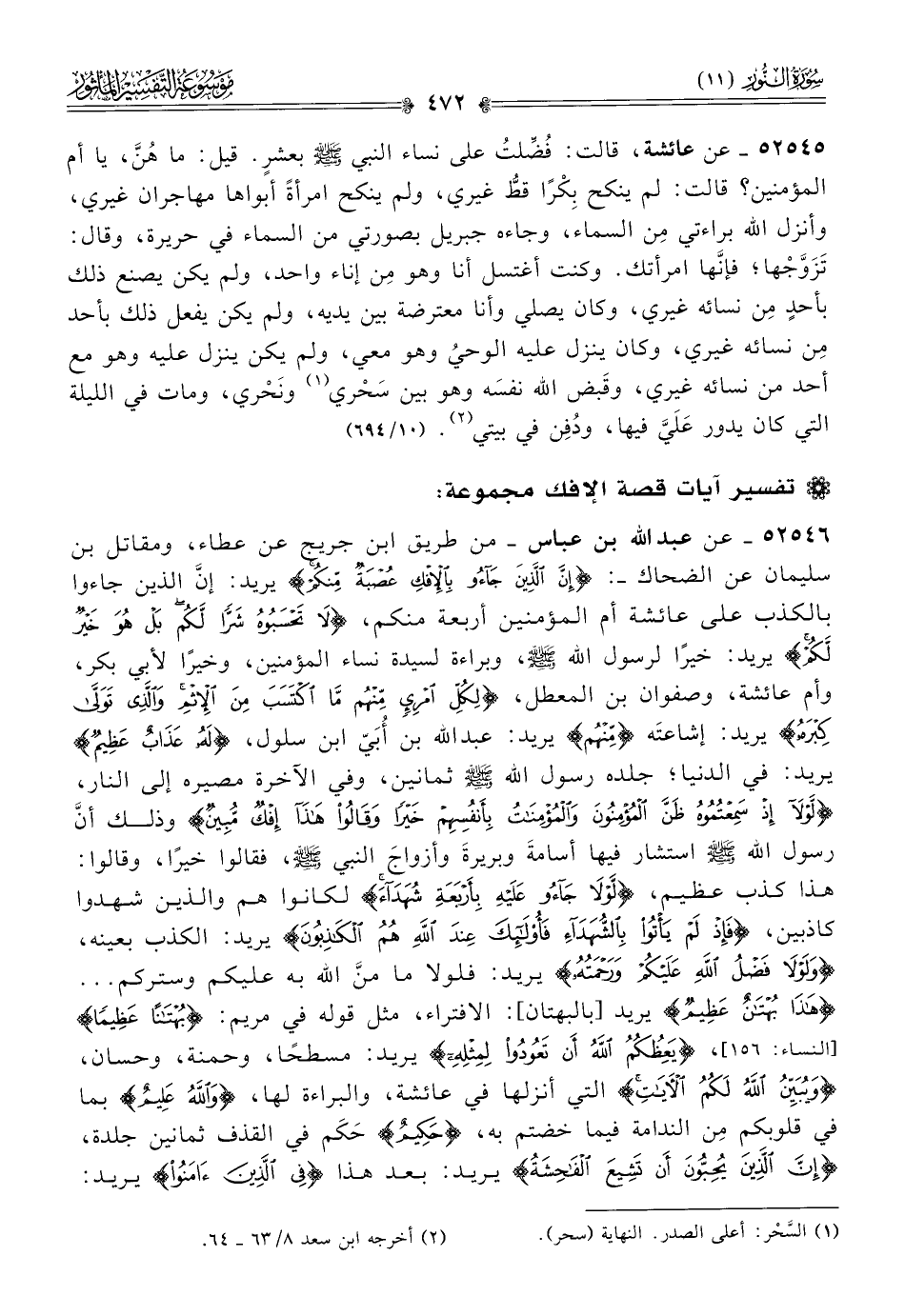 ٥٢٥٤٦ - عن عبد الله بن عباس -من طريق ابن جريج عن عطاء، ومقاتل بن سليمان عن الضحاك-: {إن الذين جاءوا بالإفك عصبة منكم} يريد: إنّ الذين جاءوا بالكذب على عائشة أم المؤمنين أربعة منكم، {لا تحسبوه شرا لكم بل هو خير لكم} يريد: خيرًا لرسول الله - صلى الله عليه وسلم -، وبراءة لسيدة نساء المؤمنين، وخيرًا لأبي بكر، وأم عائشة، وصفوان بن المعطل، {لكل امرئ منهم ما اكتسب من الاثم والذي تولى كبره} يريد: إشاعتَه {منهم} يريد: عبد الله بن أُبَيّ بن سلول، {له عذاب عظيم} يريد: في الدنيا؛ جلده رسول الله - صلى الله عليه وسلم - ثمانين، وفي الآخرة مصيره إلى النار، {لولا اذ سمعتموه ظن المؤمنون والمؤمنات بأنفسهم خيرا وقالوا هذا أفك مبين} وذلك أنّ رسول الله - صلى الله عليه وسلم - استشار فيها أسامةَ وبريرةَ وأزواجَ النبي - صلى الله عليه وسلم -، فقالوا خيرًا، وقالوا: هذا كذب عظيم، {لولا جاءوا عليه بأربعة شهداء} لكانوا هم والذين شهدوا كاذبين، {فإذ لم يأتوا بالشهداء فأولئك عند الله هم الكاذبون} يريد: الكذب بعينه، {ولولا فضل الله عليكم ورحمته} يريد: فلولا ما منَّ الله به عليكم وستركم ... {هذا بهتان عظيم} يريد [بالبهتان]: الافتراء، مثل قوله في مريم: {بهتانا عظيما} [النساء: ١٥٦]، {يعظكم الله أن تعودوا لمثله} يريد: مسطحًا، وحمنة، وحسان، {ويبين الله لكم الآيات} التي أنزلها في عائشة، والبراءة لها، {والله عليم} بما في قلوبكم مِن الندامة فيما خضتم به، {حكيم} حَكَم في القذف ثمانين جلدة، {ان الذين يحبون أن تشيع الفاحشة} يريد: بعد هذا {في الذين آمنوا} يريد: