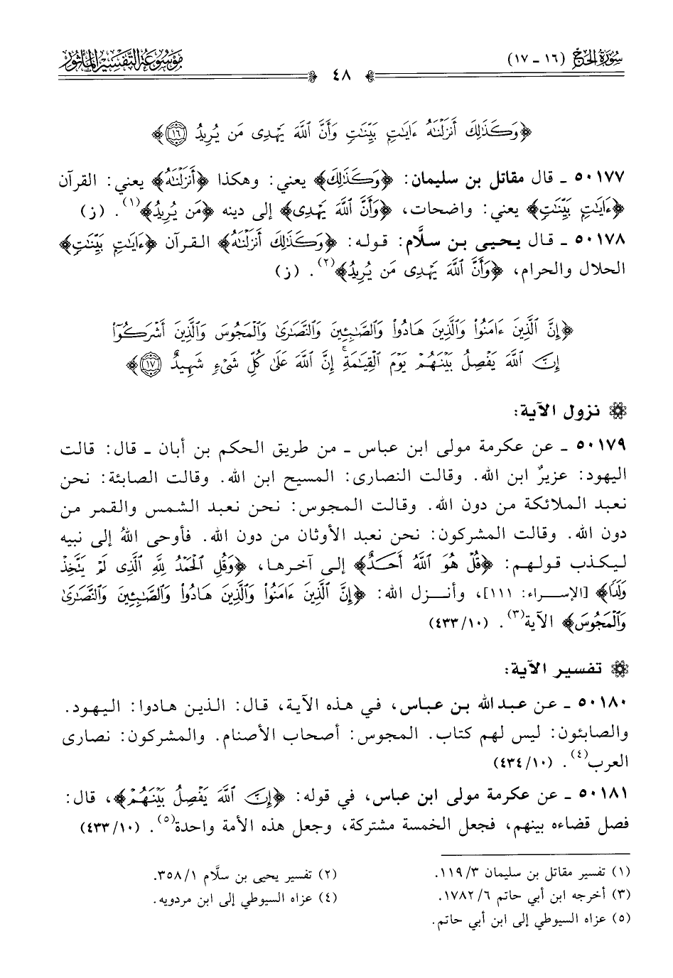 ٥٠١٨٠ - عن عبد الله بن عباس، في هذه الآية، قال: الذين هادوا: اليهود. والصابئون: ليس لهم كتاب. المجوس: أصحاب الأصنام. والمشركون: نصارى العرب (¬٤). (١٠/ ٤٣٤)