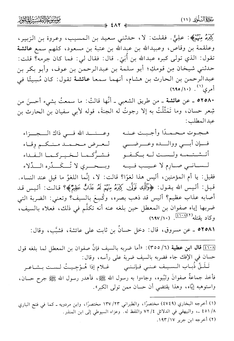 [٤٦٠٨] قال ابن عطية (٦/ ٣٥٥): "أما ضربه بالسيف فإنّ صفوان بن المعطل لما بلغه قول حسان في الإفك جاء فضربه بالسيف ضربة على رأسه، وقال: