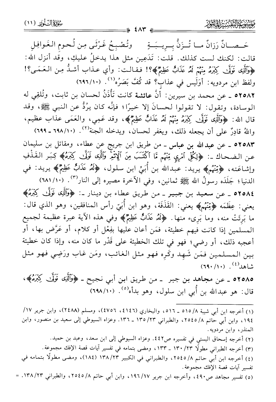 ٥٢٥٨٤ - عن سعيد بن جبير -من طريق عطاء بن دينار-: {والذي تولى كبره} يعني: عِظَمَه {منهم} يعني: القَذَفَة، وهو ابن أُبَيّ رأس المنافقين، وهو الذي قال: ما بَرِئَتْ منه، وما بَرِئ منها. {له عذاب عظيم} وفي هذه الآية عبرة عظيمة لجميع المسلمين إذا كانت فيهم خطيئة، فمَن أعان عليها بفِعْل أو كلام، أو عَرَّض بها، أو أعجبه ذلك، أو رضي؛ فهو في تلك الخطيئة على قَدْر ما كان منه، وإذا كان خطيئة بين المسلمين فمَن شَهِد وكَرِه فهو مثل الغائب، ومَن غاب ورَضِي فهو مثل شاهد (¬٤). (١٠/ ٦٩٠)