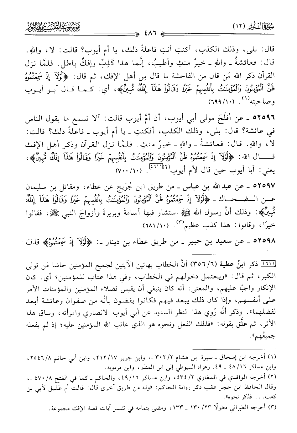 ٥٢٥٩٦ - عن أفْلَحَ مولى أبي أيوب، أن أمَّ أيوب قالت: ألا تسمع ما يقول الناس في عائشة؟ قال: بلى، وذلك الكذب، أفكنتِ -يا أم أيوب- فاعلةً ذلك؟ قالت: لا، واللهِ. قال: فعائشةُ -واللهِ- خيرٌ منكِ. فلمّا نزل القرآن وذكر أهل الإفك قال الله: {لولا إذ سمعتموه ظن المؤمنون والمؤمنات بأنفسهم خيرا وقالوا هذا إفك مبين}، يعني: أبا أيوب حين قال لأم أيوب (¬٢) [٤٦١١]. (١٠/ ٧٠٠)