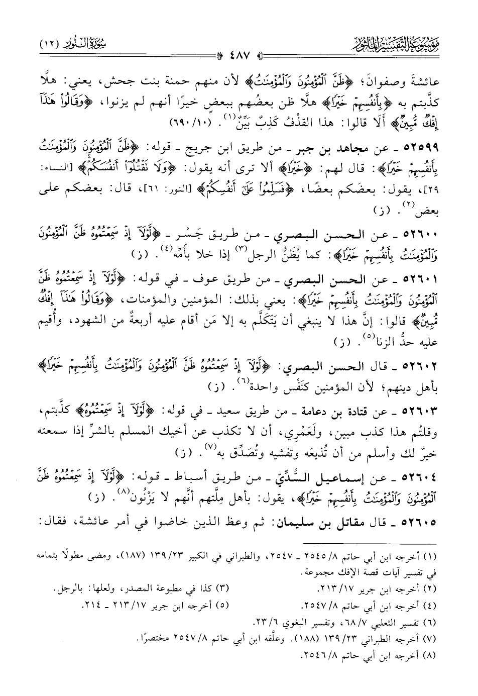 ٥٢٦٠٢ - قال الحسن البصري: {لولا إذ سمعتموه ظن المؤمنون والمؤمنات بأنفسهم خيرا} بأهل دينهم؛ لأن المؤمنين كنَفْس واحدة (¬٦). (ز)