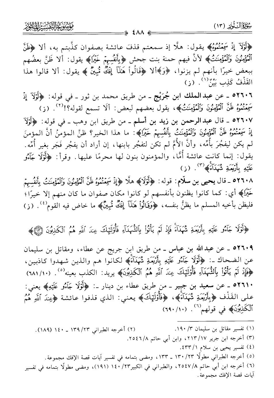 ٥٢٦٠٦ - عن عبد الملك ابن جُرَيْج -من طريق محمد بن ثور- في قوله: {لولا إذ سمعتموه ظن المؤمنون والمؤمنات}، يقول بعضهم لبعض: ألا تسمع لقوله؟! (¬٢). (ز)