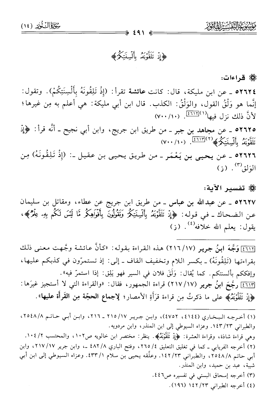 ٥٢٦٢٥ - عن مجاهد بن جبر -من طريق ابن جريج، وابن أبي نجيح- أنّه قرأ: {إذْ تَلَقَّوْنَهُ بِأَلْسِنَتِكُمْ} (¬٢) [٤٦١٣]. (١٠/ ٧٠٠)