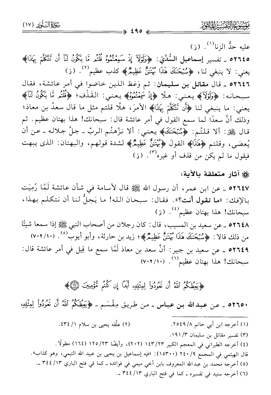 ٥٢٦٤٩ - عن سعيد بن جبير: أنّ سعد بن معاذ لَمّا سمع ما قِيل في أمر عائشة قال: سبحانك! هذا بهتان عظيم (¬٦). (١٠/ ٧٠٢)