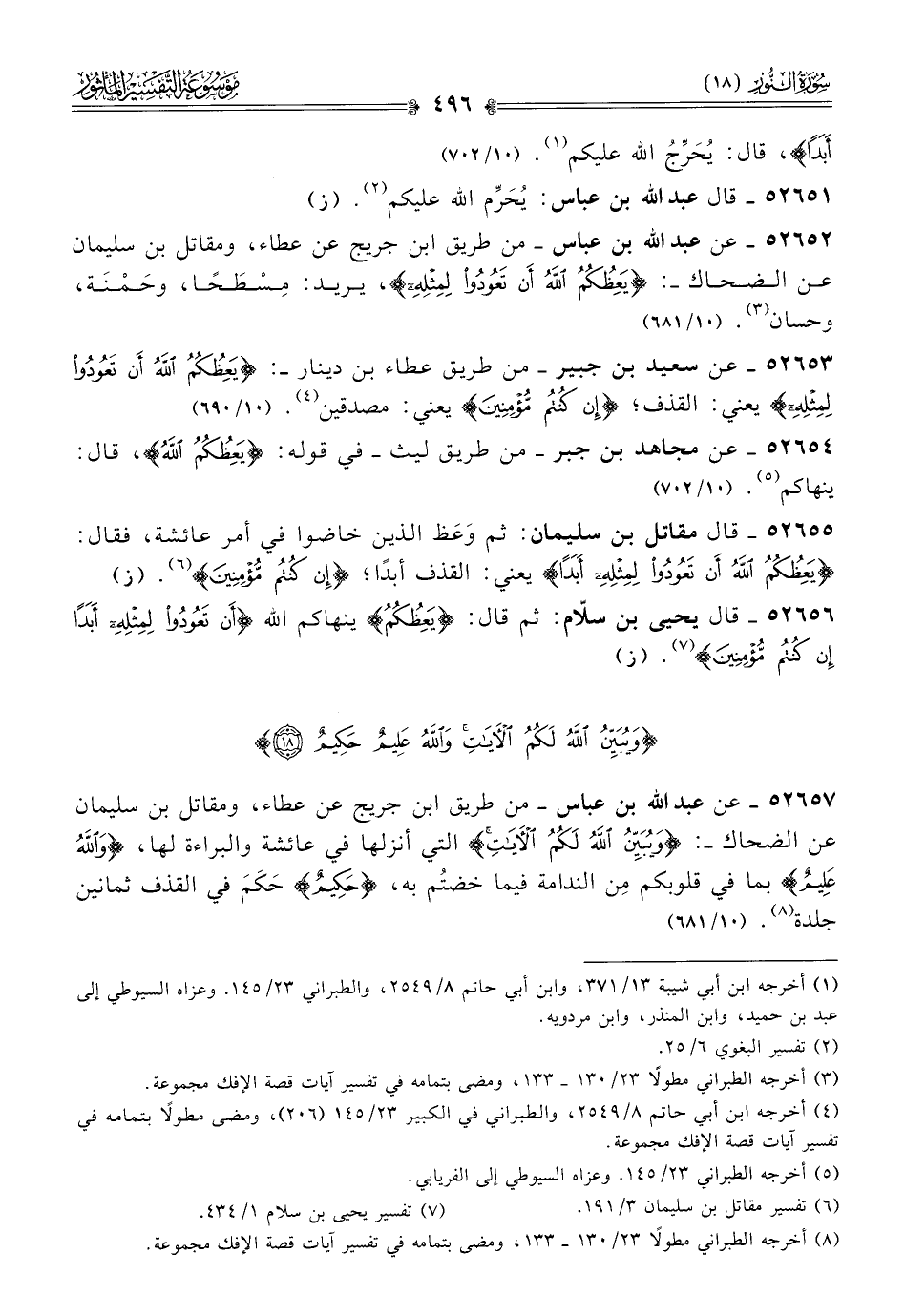٥٢٦٥٧ - عن عبد الله بن عباس -من طريق ابن جريج عن عطاء، ومقاتل بن سليمان عن الضحاك-: {ويبين الله لكم الآيات} التي أنزلها في عائشة والبراءة لها، {والله عليم} بما في قلوبكم مِن الندامة فيما خضتُم به، {حكيم} حَكَمَ في القذف ثمانين جلدة (¬٨). (١٠/ ٦٩٠)