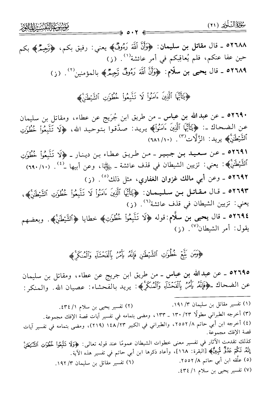 ٥٢٦٩١ - عن سعيد بن جبير -من طريق عطاء بن دينار- {لا تتبعوا خطوات الشيطان}: يعني: تزيين الشيطان في قذف عائشة - رضي الله عنها -، وعن أبيها- (¬٤). (١٠/ ٦٩٠)