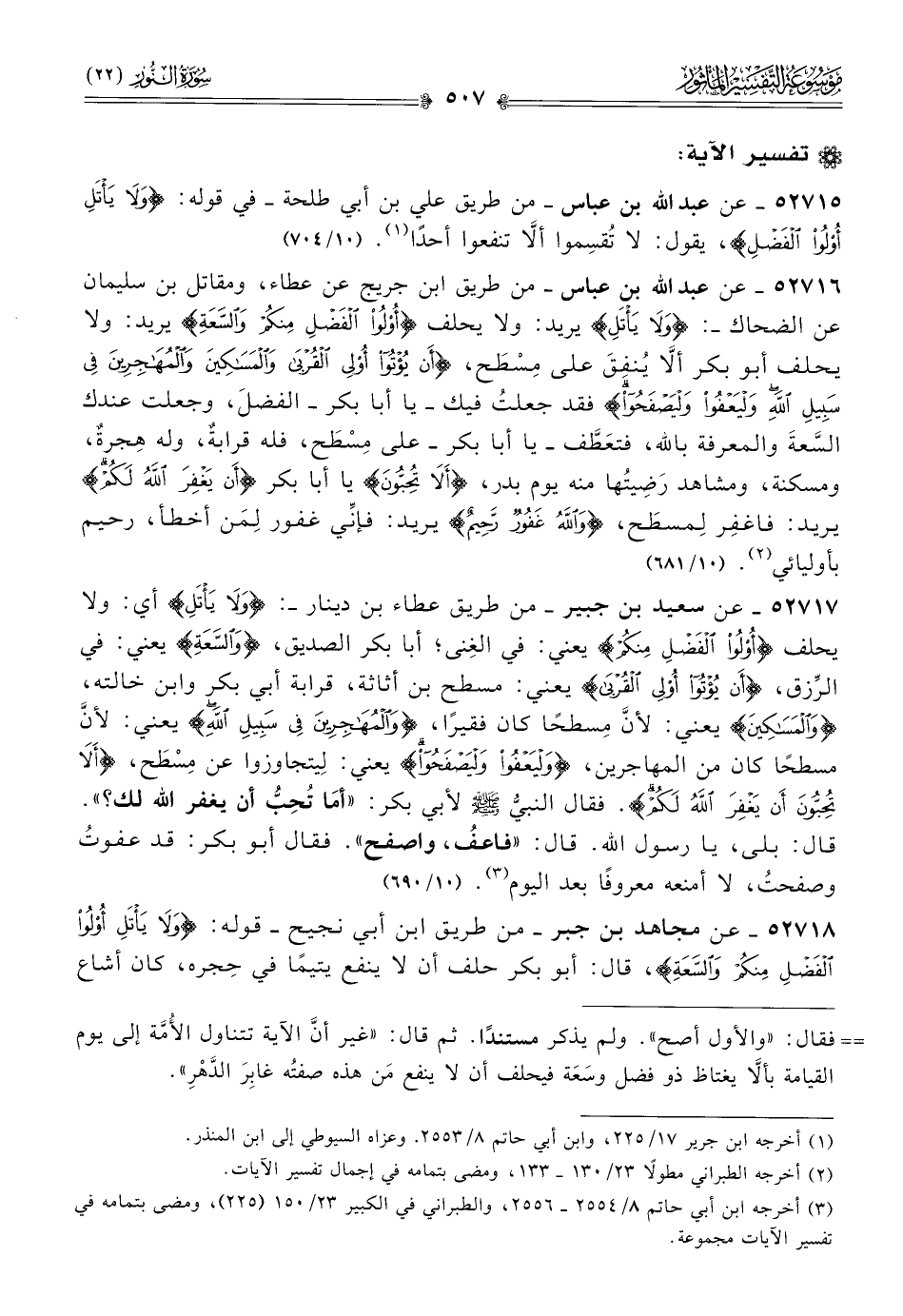 ٥٢٧١٧ - عن سعيد بن جبير -من طريق عطاء بن دينار-: {ولا يأتل} أي: ولا يحلف {أولو الفضل منكم} يعني: في الغِنى؛ أبا بكر الصديق، {والسعة} يعني: في الرِّزق، {أن يؤتوا أولي القربى} يعني: مسطح بن أثاثة، قرابة أبي بكر وابن خالته، {والمساكين} يعني: لأنّ مِسطحًا كان فقيرًا، {والمهاجرين في سبيل الله} يعني: لأنّ مسطحًا كان من المهاجرين، {وليعفوا وليصفحوا} يعني: لِيتجاوزوا عن مِسْطَح، {ألا تحبون أن يغفر الله لكم}. فقال النبيُّ - صلى الله عليه وسلم - لأبي بكر: «أما تُحِبُّ أن يغفر الله لك؟». قال: بلى، يا رسول الله. قال: «فاعفُ، واصفح». فقال أبو بكر: قد عفوتُ وصفحتُ، لا أمنعه معروفًا بعد اليوم (¬٣). (١٠/ ٦٩٠)