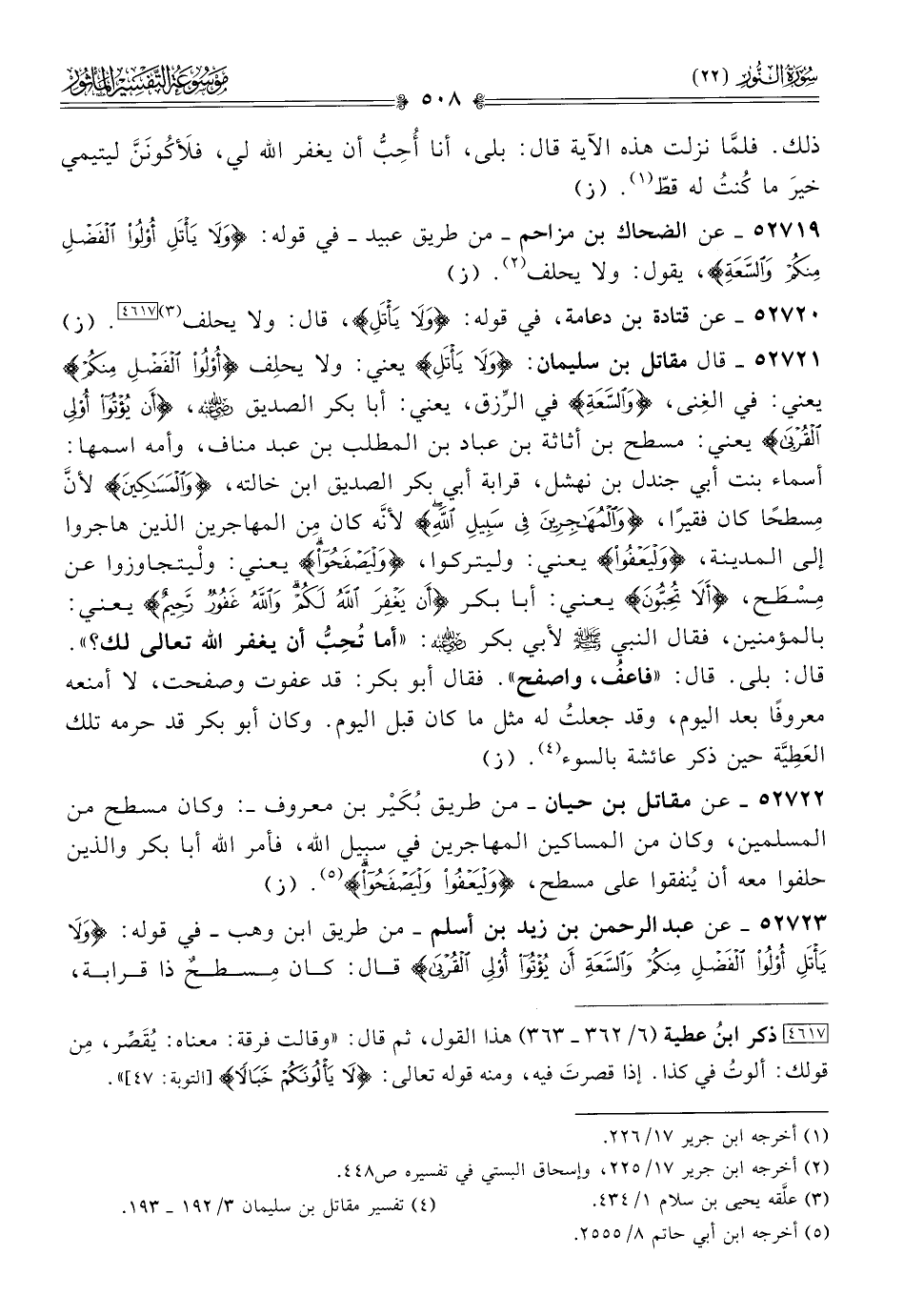 ٥٢٧٢٣ - عن عبد الرحمن بن زيد بن أسلم -من طريق ابن وهب- في قوله: {ولا يأتل أولو الفضل منكم والسعة أن يؤتوا أولي القربى} قال: كان مِسطحٌ ذا قرابة،