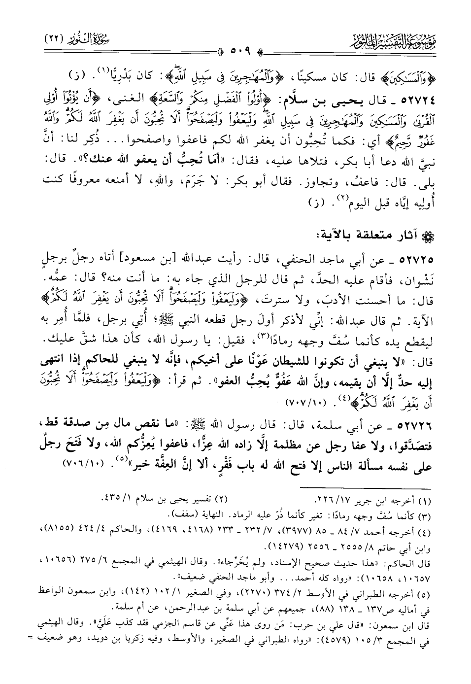 ٥٢٧٢٤ - قال يحيى بن سلّام: {أولو الفضل منكم والسعة} الغنى، {أن يؤتوا أولي القربى والمساكين والمهاجرين في سبيل الله وليعفوا وليصفحوا ألا تحبون أن يغفر الله لكم والله غفور رحيم} أي: فكما تُحِبُّون أن يغفر الله لكم فاعفوا واصفحوا ... ذُكِر لنا: أنّ نبيَّ الله دعا أبا بكر، فتلاها عليه، فقال: «أما تُحِبُّ أن يعفو الله عنك؟». قال: بلى. قال: فاعفُ، وتجاوز. فقال أبو بكر: لا جَرَمَ، واللهِ، لا أمنعه معروفًا كنت أُولِيه إيّاه قبل اليوم (¬٢). (ز)