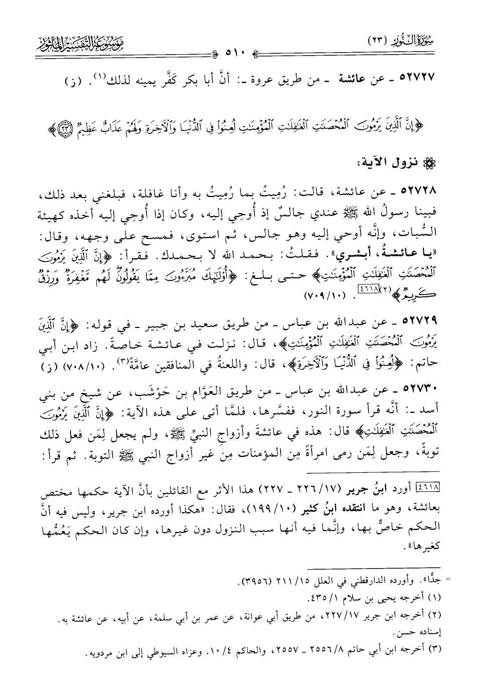 [٤٦١٨] أورد ابنُ جرير (١٧/ ٢٢٦ - ٢٢٧) هذا الأثر مع القائلين بأنّ الآية حكمها مختص بعائشة، وهو ما انتقده ابنُ كثير (١٠/ ١٩٩)، فقال: «هكذا أورده ابن جرير، وليس فيه أنّ الحكم خاصٌّ بها، وإنّما فيه أنها سبب النزول دون غيرها، وإن كان الحكم يَعُمُّها كغيرها».