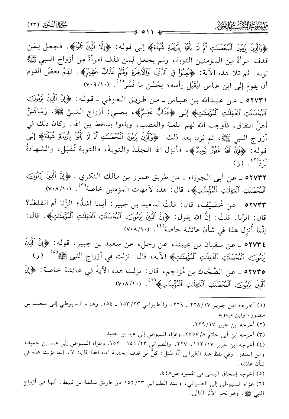 ٥٢٧٣٤ - عن سفيان بن عيينة، عن رجل، عن سعيد بن جبير، قوله: {إن الذين يرمون المحصنات الغافلات المؤمنات} الآية، قال: نزلت في أزواج النبي - صلى الله عليه وسلم - (¬٥). (ز)