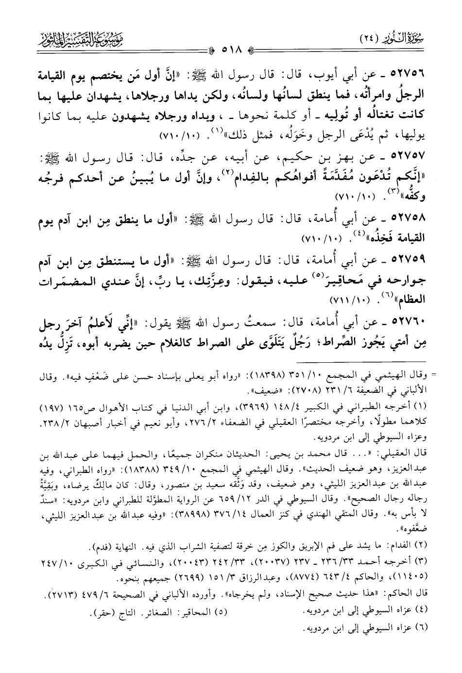 ٥٢٧٥٨ - عن أبي أُمامة، قال: قال رسول الله - صلى الله عليه وسلم -: «أول ما ينطق مِن ابن آدم يوم القيامة فَخِذُه» (¬٤). (١٠/ ٧١٠)