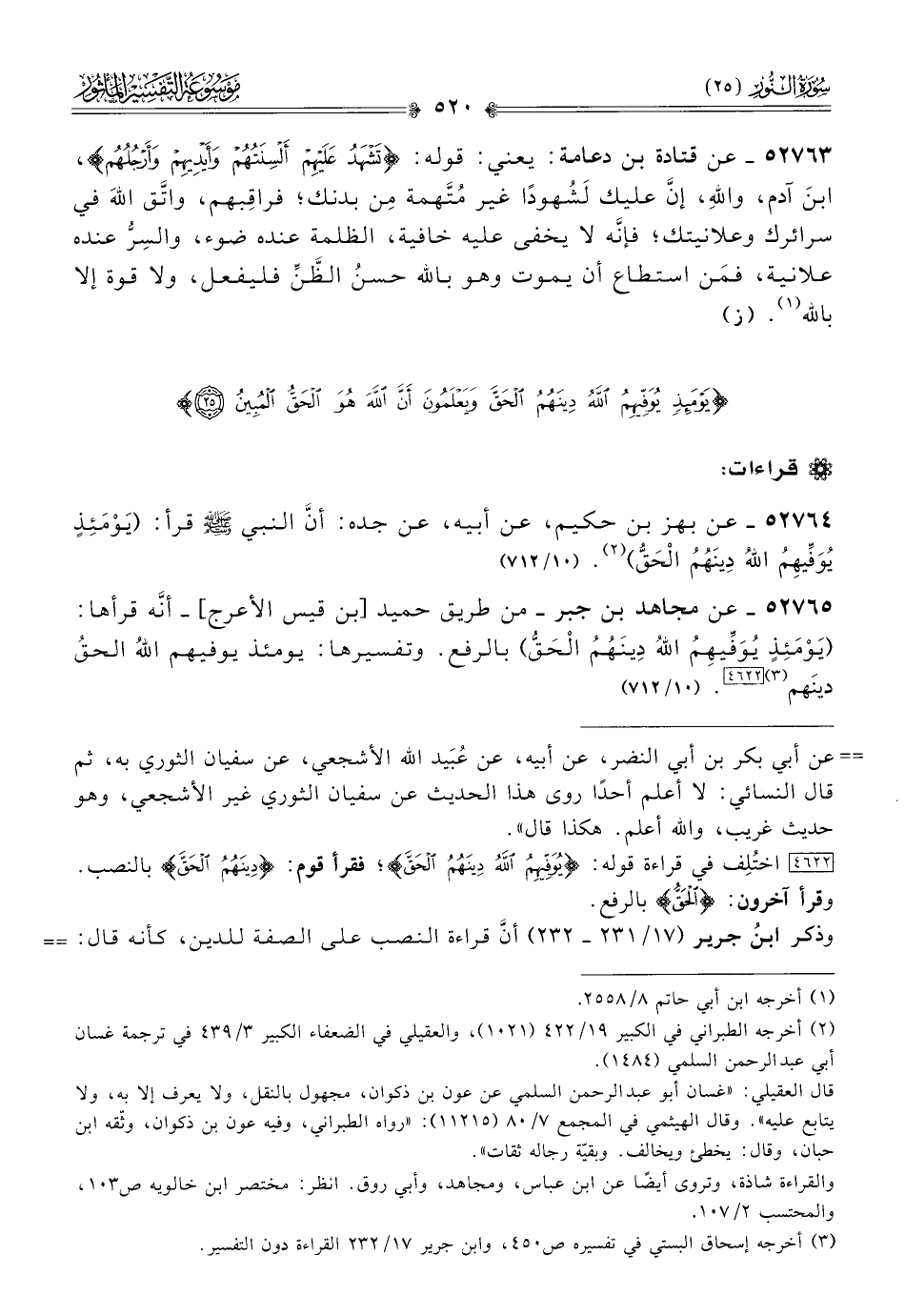 ٥٢٧٦٥ - عن مجاهد بن جبر-من طريق حميد [بن قيس الأعرج]- أنّه قرأها: (يَوْمَئِذٍ يُوَفِّيهِمُ اللَّهُ دِينَهُمُ الحَقُّ) بالرفع. وتفسيرها: يومئذ يوفيهم اللهُ الحقُ دينَهم (¬٣) [٤٦٢٢]. (١٠/ ٧١٢)