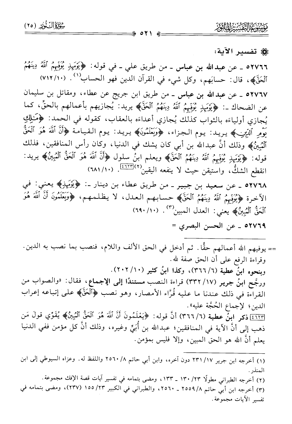 ٥٢٧٦٨ - عن سعيد بن جبير -من طريق عطاء بن دينار-: {يومئذ} يعني: في الآخرة {يوفيهم الله دينهم الحق} حسابهم العدل، لا يظلمهم، {ويعلمون ان الله هو الحق المبين} يعني: العدل المبين (¬٣). (١٠/ ٦٩٠)