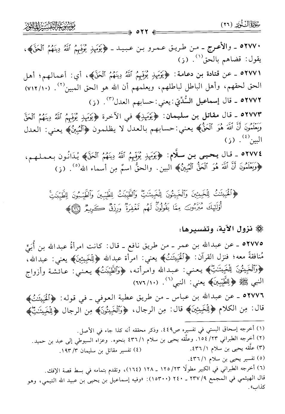 ٥٢٧٧٤ - قال يحيى بن سلّام: {يَوْمَئِذٍ يُوَفِّيهِمُ اللَّهُ دِينَهُمُ الحَقَّ} يُدانُون بعملهم، {ويَعْلَمُونَ أنَّ اللَّهَ هُوَ الحَقُّ المُبِينُ} البين. والحقُّ اسمٌ مِن أسماء الله (¬٥). (ز)
