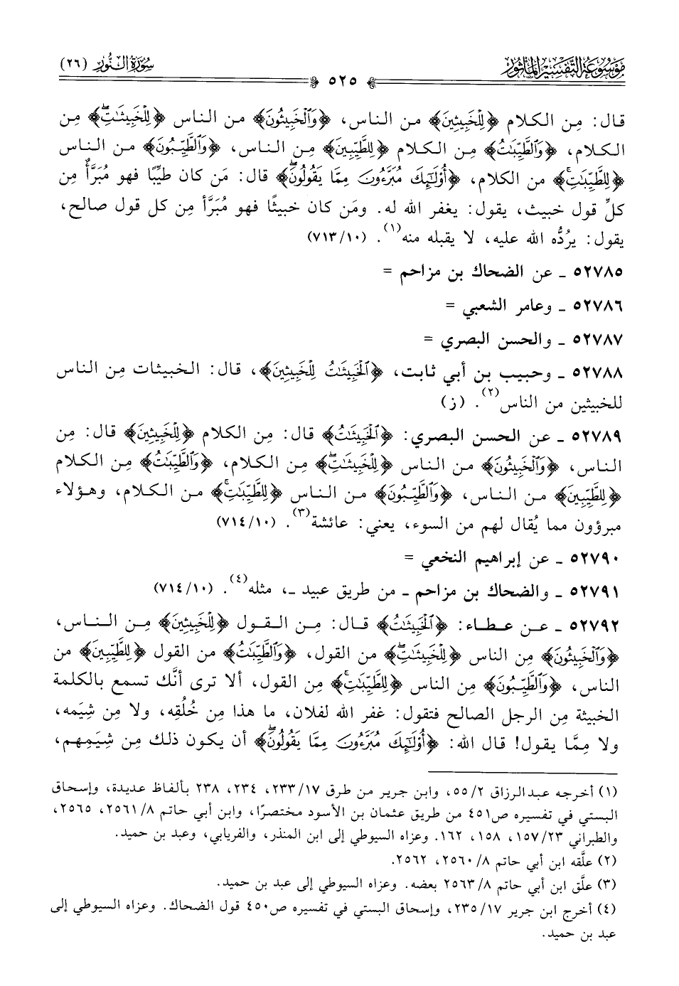 ٥٢٧٨٩ - عن الحسن البصري: {الخبيثات} قال: مِن الكلام {للخبيثين} قال: مِن الناس، {والخبيثون} من الناس {للخبيثات} مِن الكلام، {والطيبات} مِن الكلام {للطيبين} من الناس، {والطيبون} من الناس {للطيبات} من الكلام، وهؤلاء مبرؤون مما يُقال لهم من السوء، يعني: عائشة (¬٣).
