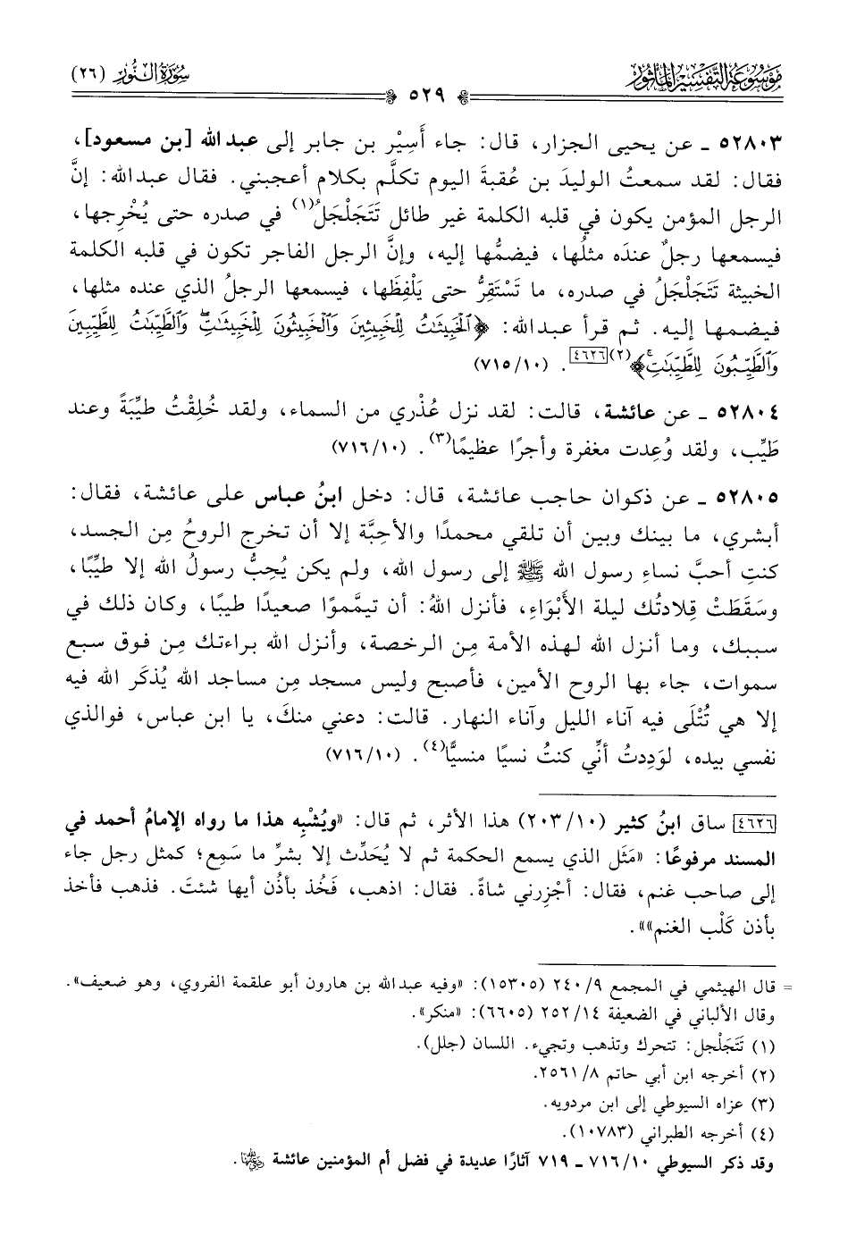 ٥٢٨٠٤ - عن عائشة، قالت: لقد نزل عُذْري من السماء، ولقد خُلِقْتُ طيِّبَةً وعند طَيِّب، ولقد وُعِدت مغفرة وأجرًا عظيمًا (¬٣). (١٠/ ٧١٦)