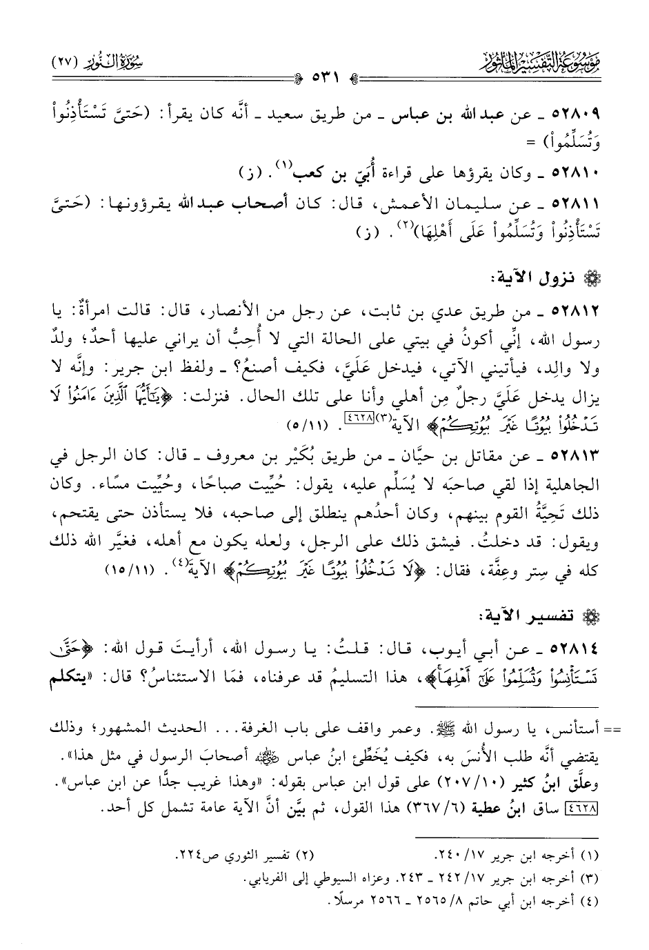 ٥٢٨٠٩ - عن عبد الله بن عباس -من طريق سعيد- أنّه كان يقرأ: (حَتىَّ تَسْتَأْذِنُواْ وتُسَلِّمُواْ) =