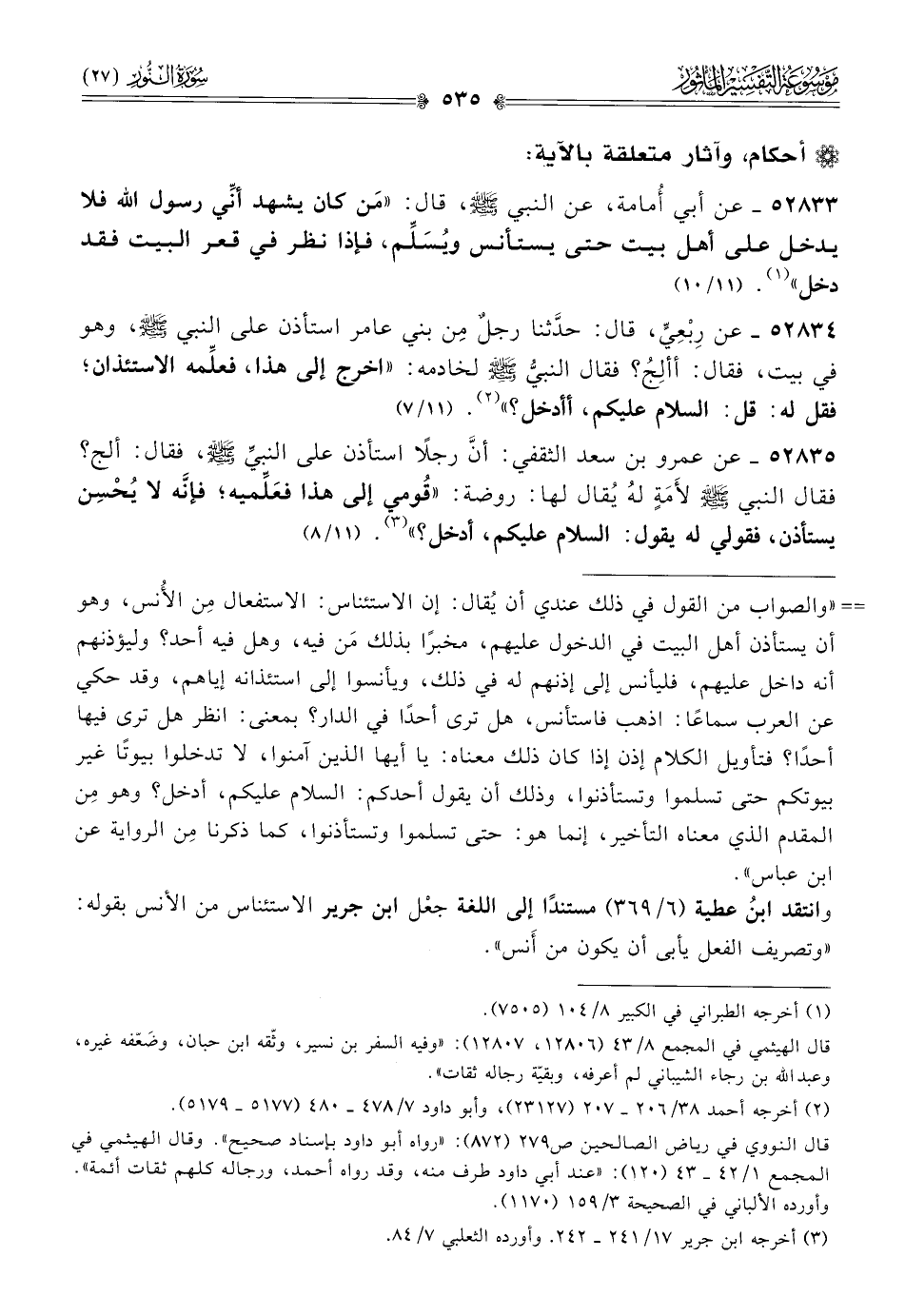 ٥٢٨٣٣ - عن أبي أُمامة، عن النبي - صلى الله عليه وسلم -، قال: «مَن كان يشهد أنِّي رسول الله فلا يدخل على أهل بيت حتى يستأنس ويُسَلِّم، فإذا نظر في قعر البيت فقد دخل» (¬١). (١١/ ١٠)