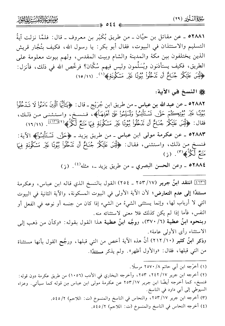 ٥٢٨٨٣ - عن عكرمة مولى ابن عباس -من طريق يزيد- {حتى تستأنسوا} الآية: فنسخ من ذلك، واستثنى، فقال: {ليس عليكم جناح أن تدخلوا بيوتا غير مسكونة فيها متاع لكم} (¬٣). (ز)