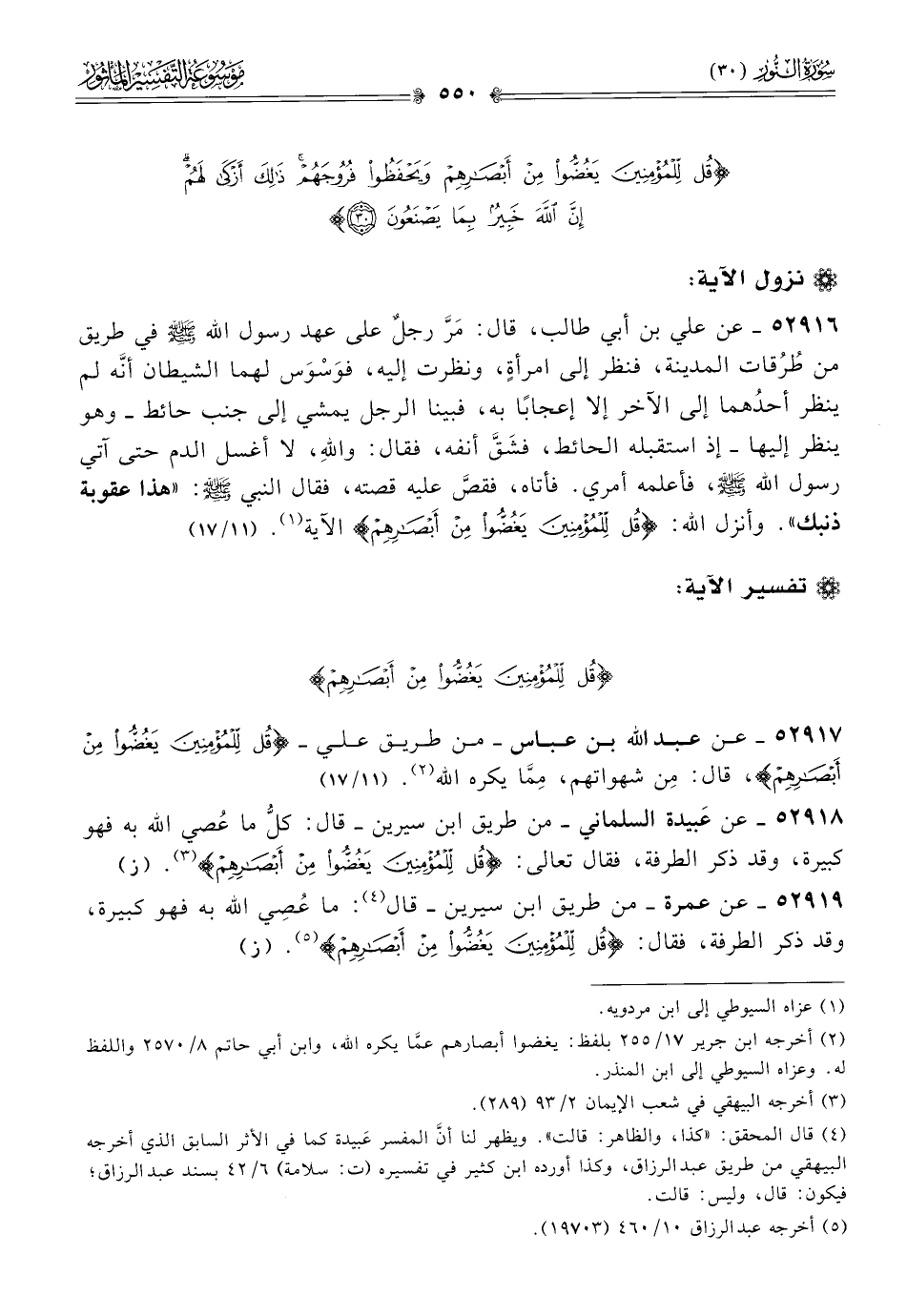 ٥٢٩١٨ - عن عَبيدة السلماني -من طريق ابن سيرين- قال: كلُّ ما عُصي الله به فهو كبيرة، وقد ذكر الطرفة، فقال تعالى: {قل للمؤمنين يغضوا من أبصارهم} (¬٣). (ز)