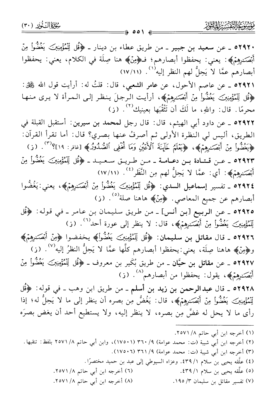 ٥٢٩٢٣ - عن قتادة بن دعامة -من طريق سعيد- {قل للمؤمنين يغضوا من أبصارهم}: أي: عمّا لا يَحِلُّ لهم مِن النَّظَر (¬٤). (١١/ ١٧)