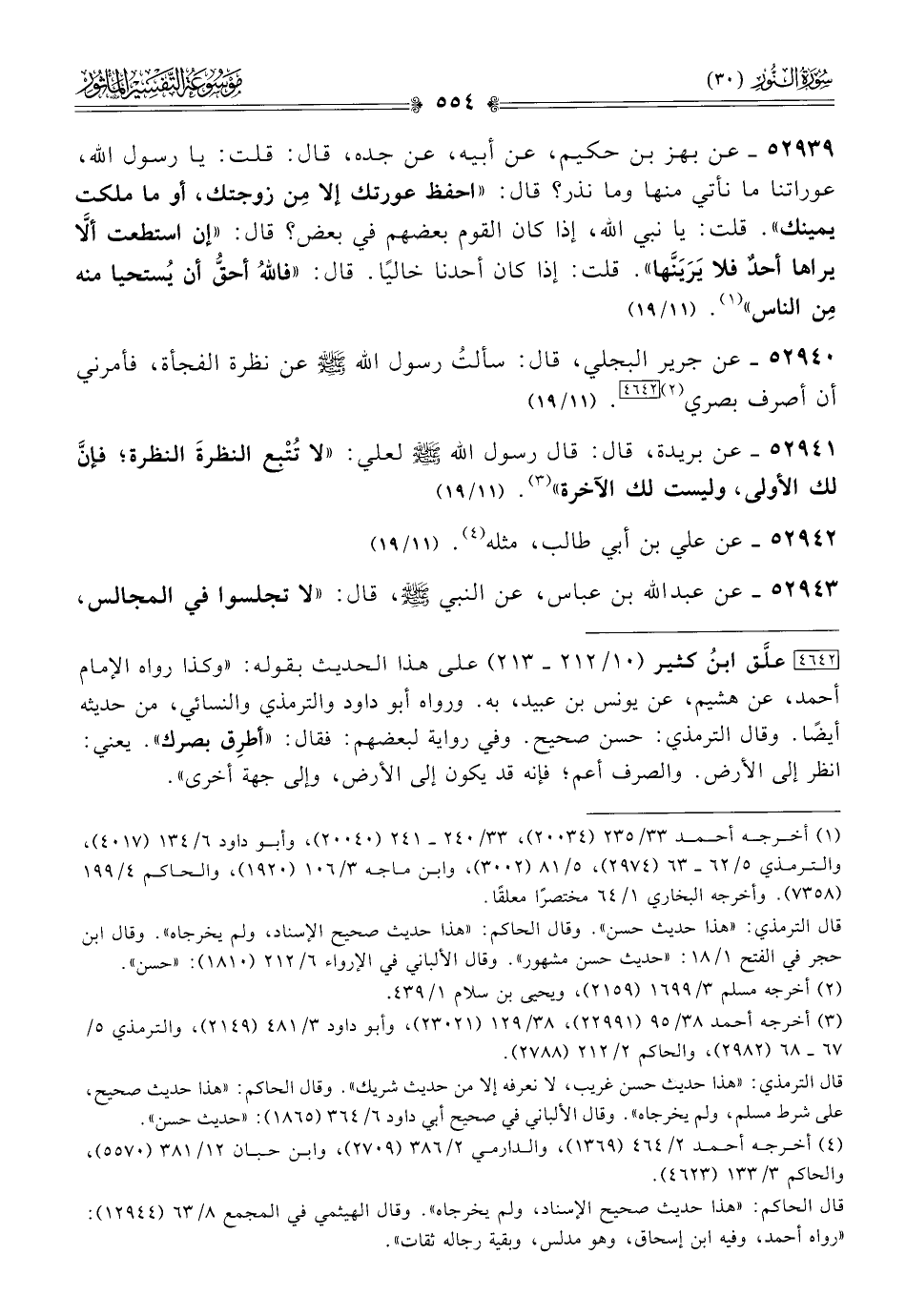 ٥٢٩٤٠ - عن جرير البجلي، قال: سألتُ رسول الله - صلى الله عليه وسلم - عن نظرة الفجأة، فأمرني أن أصرف بصري (¬٢) [٤٦٤٢]. (١١/ ١٩)