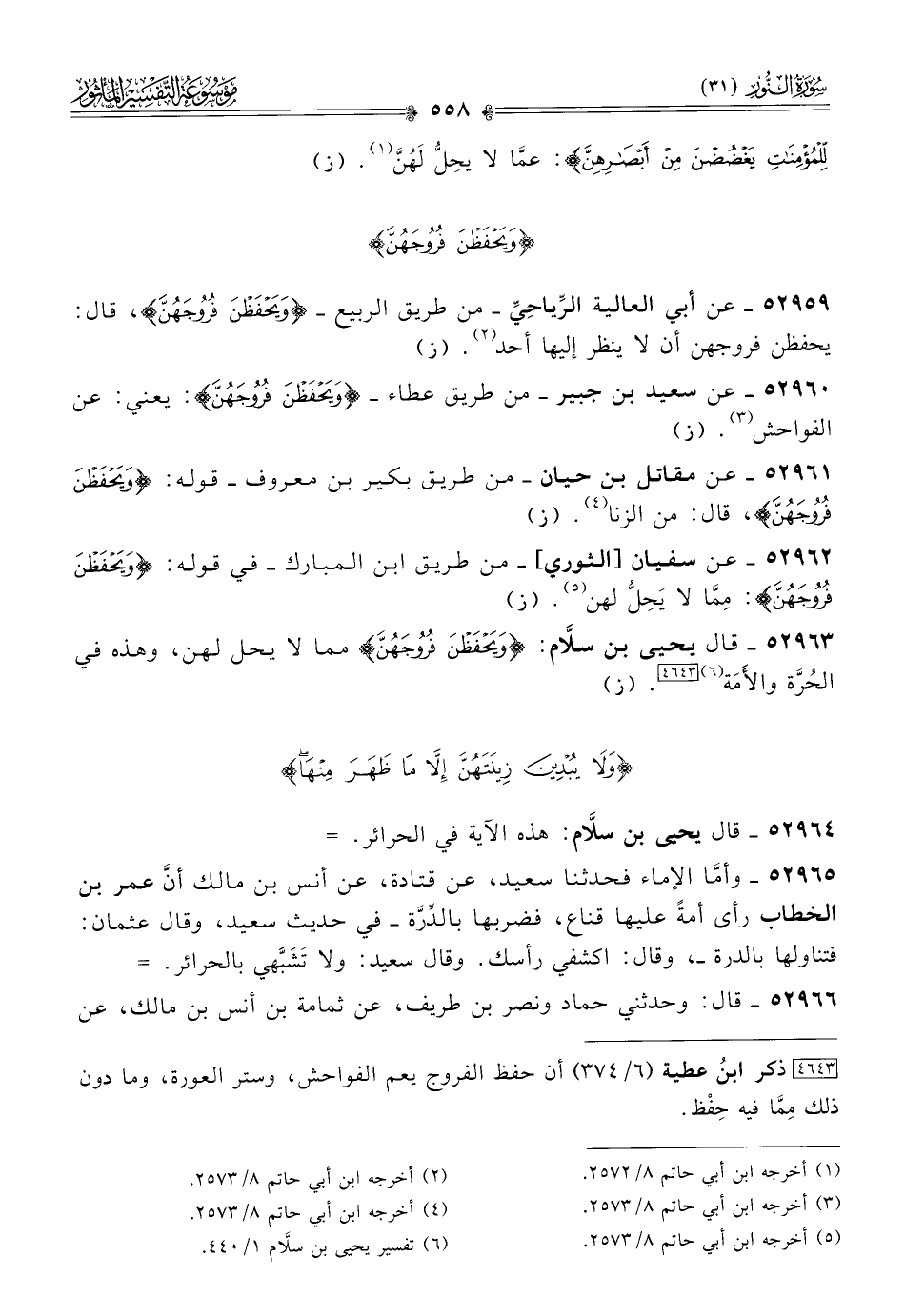 ٥٢٩٦٣ - قال يحيى بن سلّام: {ويحفظن فروجهن} مما لا يحل لهن، وهذه في الحُرَّة والأَمَة (¬٦) [٤٦٤٣]. (ز)