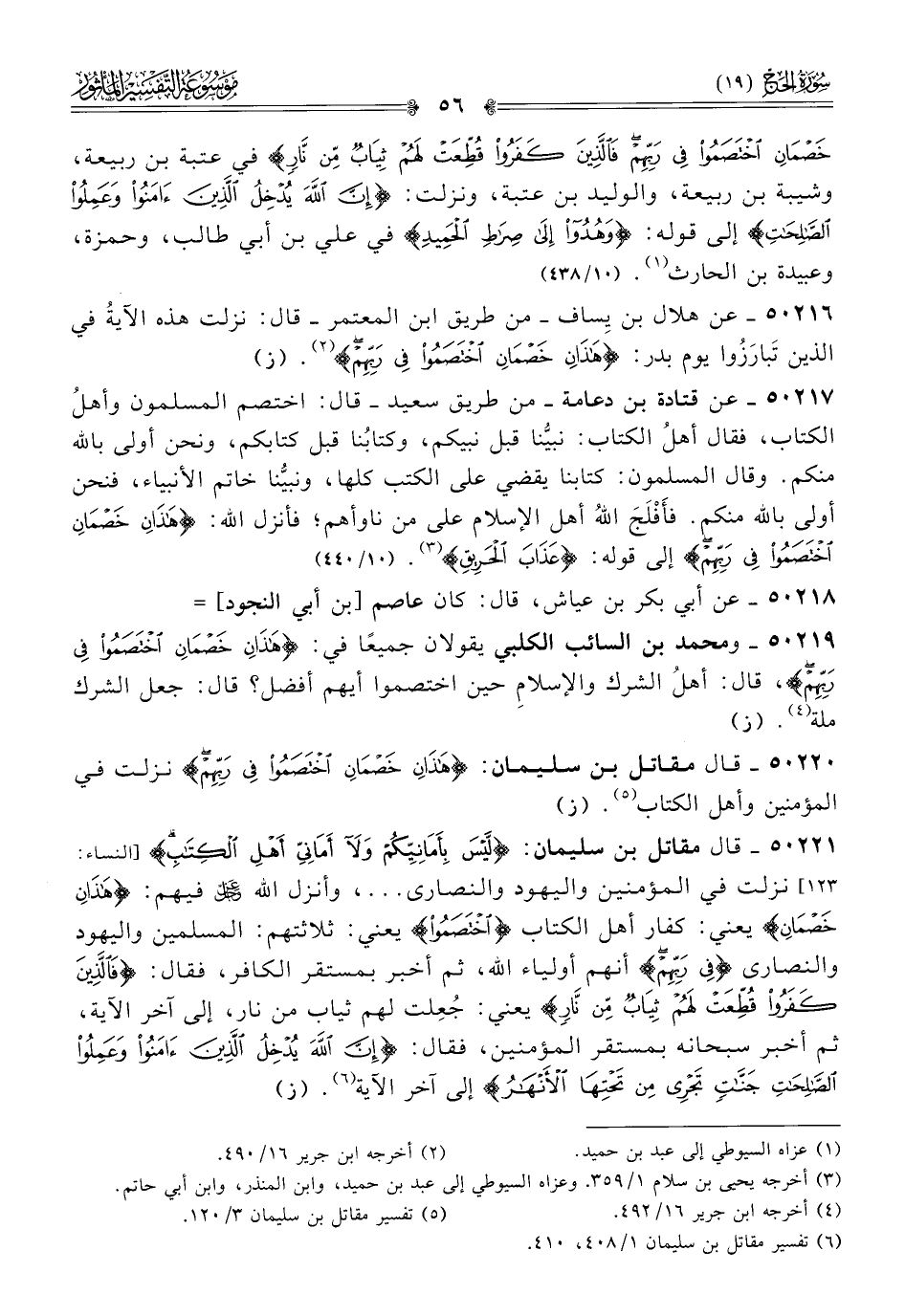 ٥٠٢٢٠ - قال مقاتل بن سليمان: {هذان خصمان اختصموا في ربهم} نزلت في المؤمنين وأهل الكتاب (¬٥). (ز)