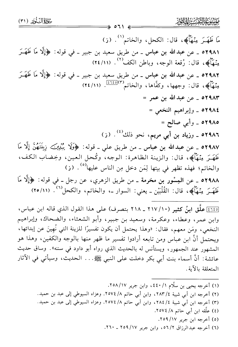 [٤٦٤٥] علَّق ابنُ كثير (١٠/ ٢١٧ - ٢١٨ بتصرف) على هذا القول الذي قاله ابن عباس، وابن عمر، وعطاء، وعكرمة، وسعيد بن جبير، وأبو الشعثاء، والضحاك، وإبراهيم النخعي، ومَن معهم، فقال: «وهذا يحتمل أن يكون تفسيرًا للزينة التي نُهِينَ عن إبدائها، ويحتمل أنّ ابن عباس ومن تابعه أرادوا تفسير ما ظهر منها بالوجه والكفين، وهذا هو المشهور عند الجمهور، ويستأنس له بالحديث الذي رواه أبو داود في سننه». وساق حديث عائشة: أنّ أسماء بنت أبي بكر دخلت على النبي - صلى الله عليه وسلم - ... الحديث، وسيأتي في الآثار المتعلقة بالآية.