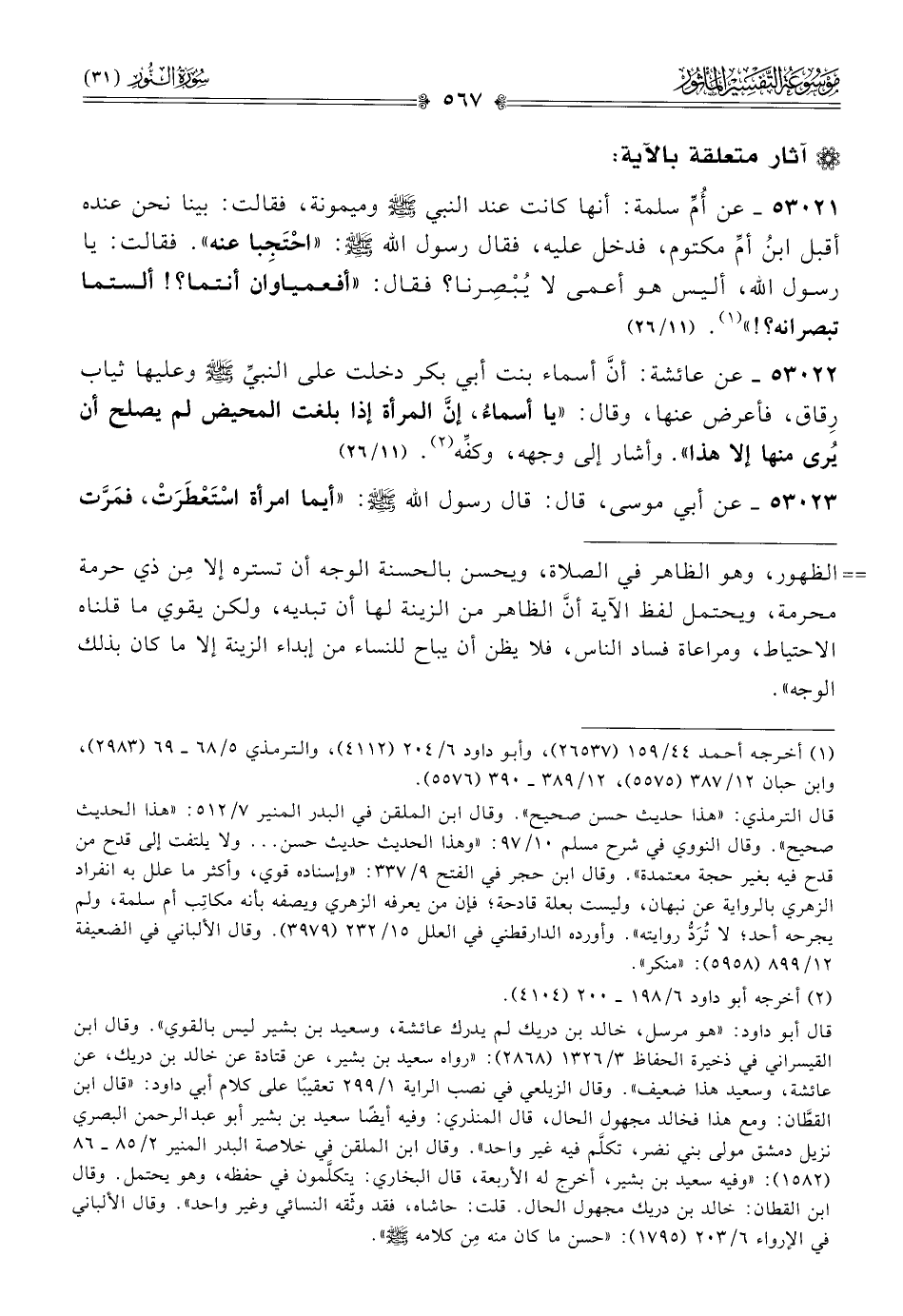 ٥٣٠٢٢ - عن عائشة: أنّ أسماء بنت أبي بكر دخلت على النبيِّ - صلى الله عليه وسلم - وعليها ثياب رِقاق، فأعرض عنها، وقال: «يا أسماءُ، إنّ المرأة إذا بلغت المحيض لم يصلح أن يُرى منها إلا هذا». وأشار إلى وجهه، وكفِّه (¬٢). (١١/ ٢٦)