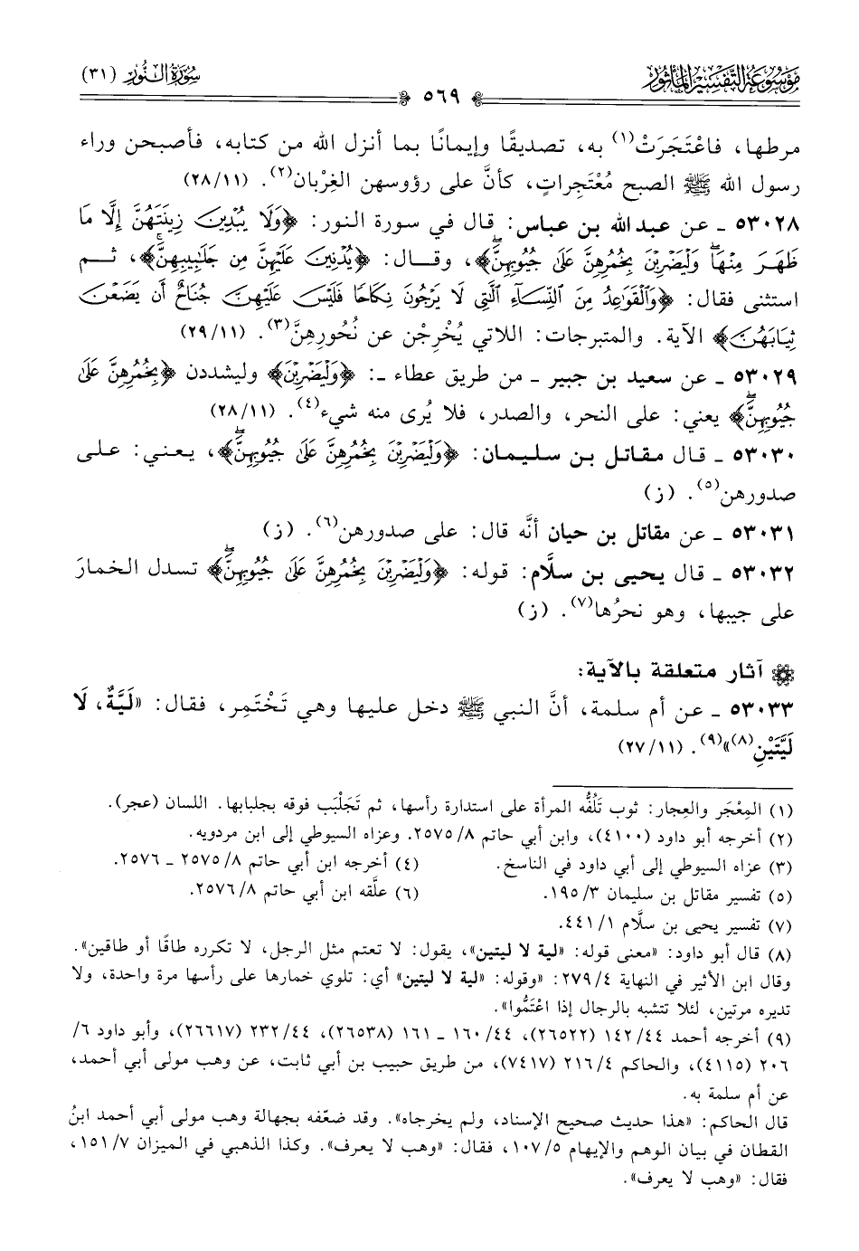 ٥٣٠٣٢ - قال يحيى بن سلّام: قوله: {وليضربن بخمرهن على جيوبهن} تسدل الخمارَ على جيبها، وهو نحرُها (¬٧). (ز)